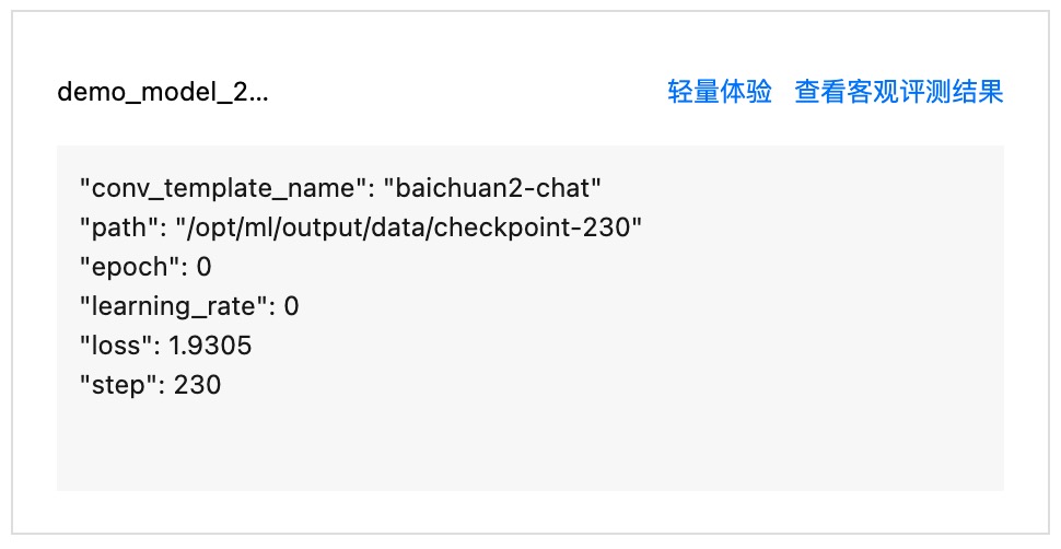 可对训练任务的 CheckPoint 快速轻量化进行评测,用户只需配置任务的基础信息和选择平台提供的内置评测集,便可开启自动评测。