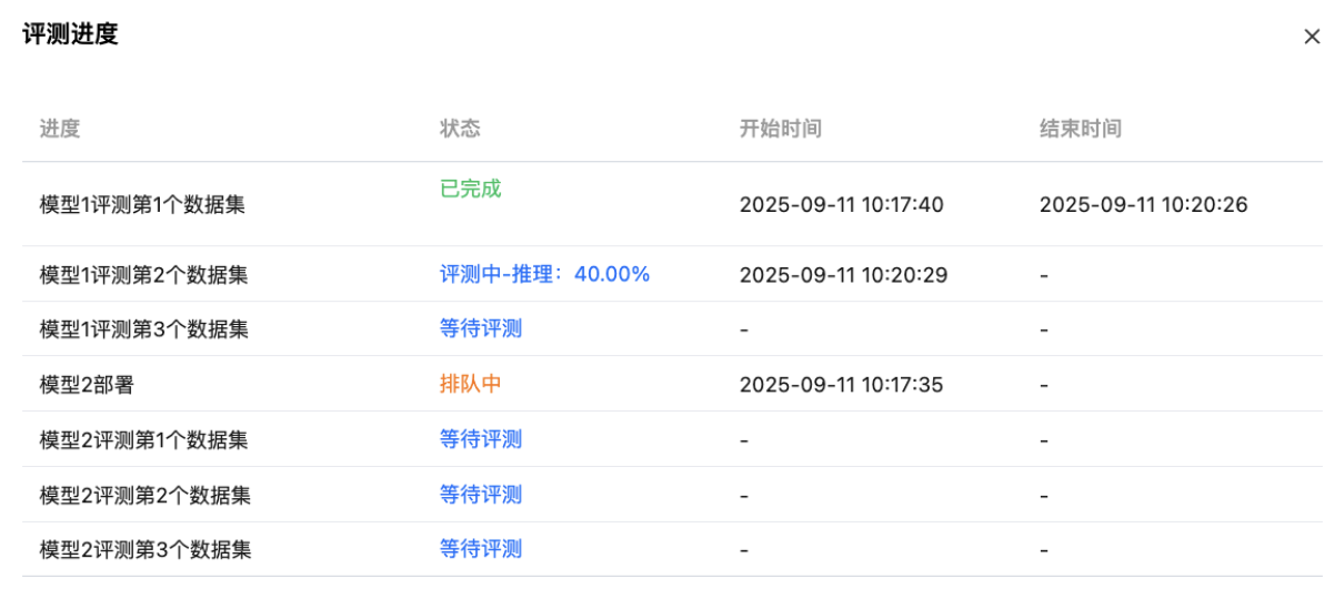 评测(推理/打分)数据总条数=模型数*评测数据条数,进度N% = 已评测(推理、打分)数据条数 / 评测(推理、打分)数据总条数%。