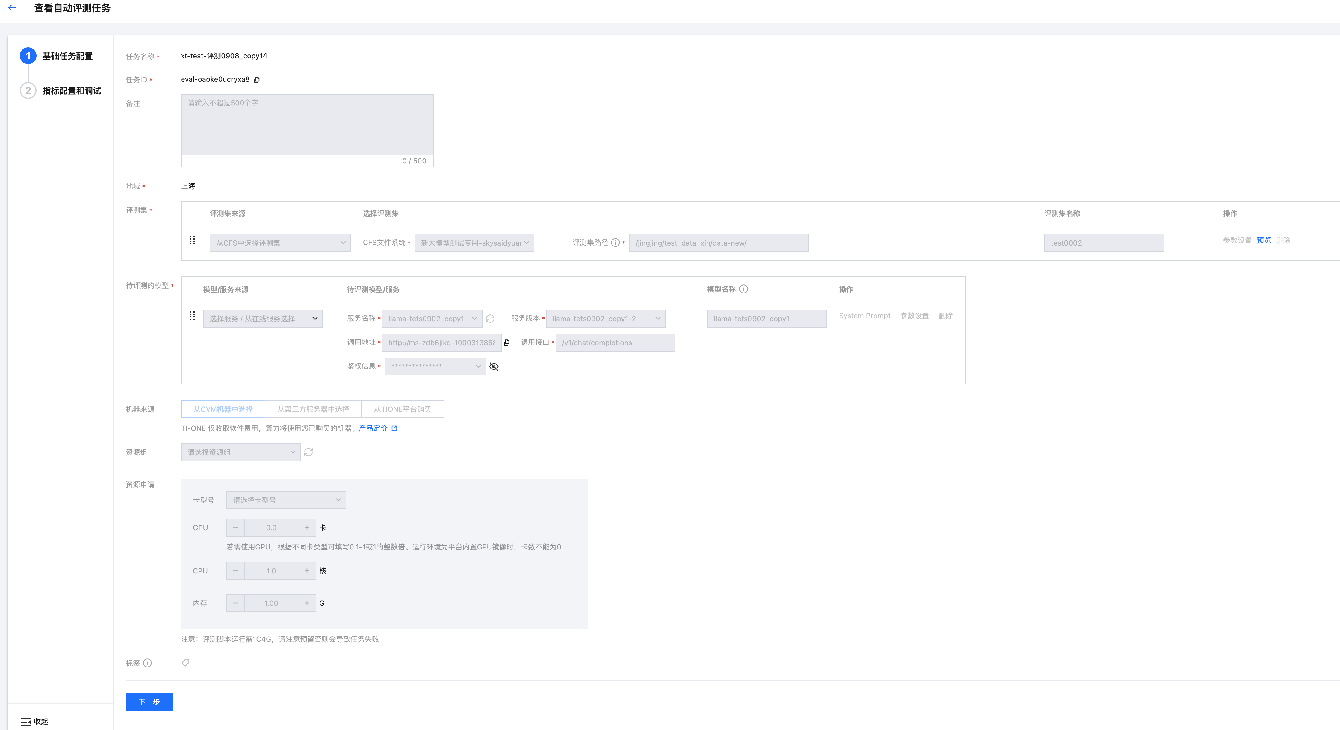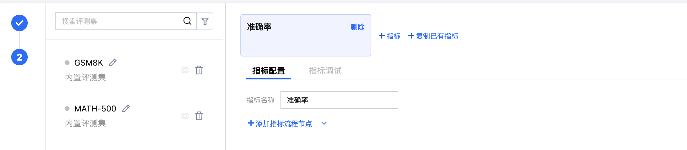 自动评测任务分为两步,第一步为基础任务配置,需要选择评测集、待评测模型、评测资源;第二步为指标配置和调试,需要自定义评测指标及其配置,并且在任务提交前可进行调试,初步查看结果。