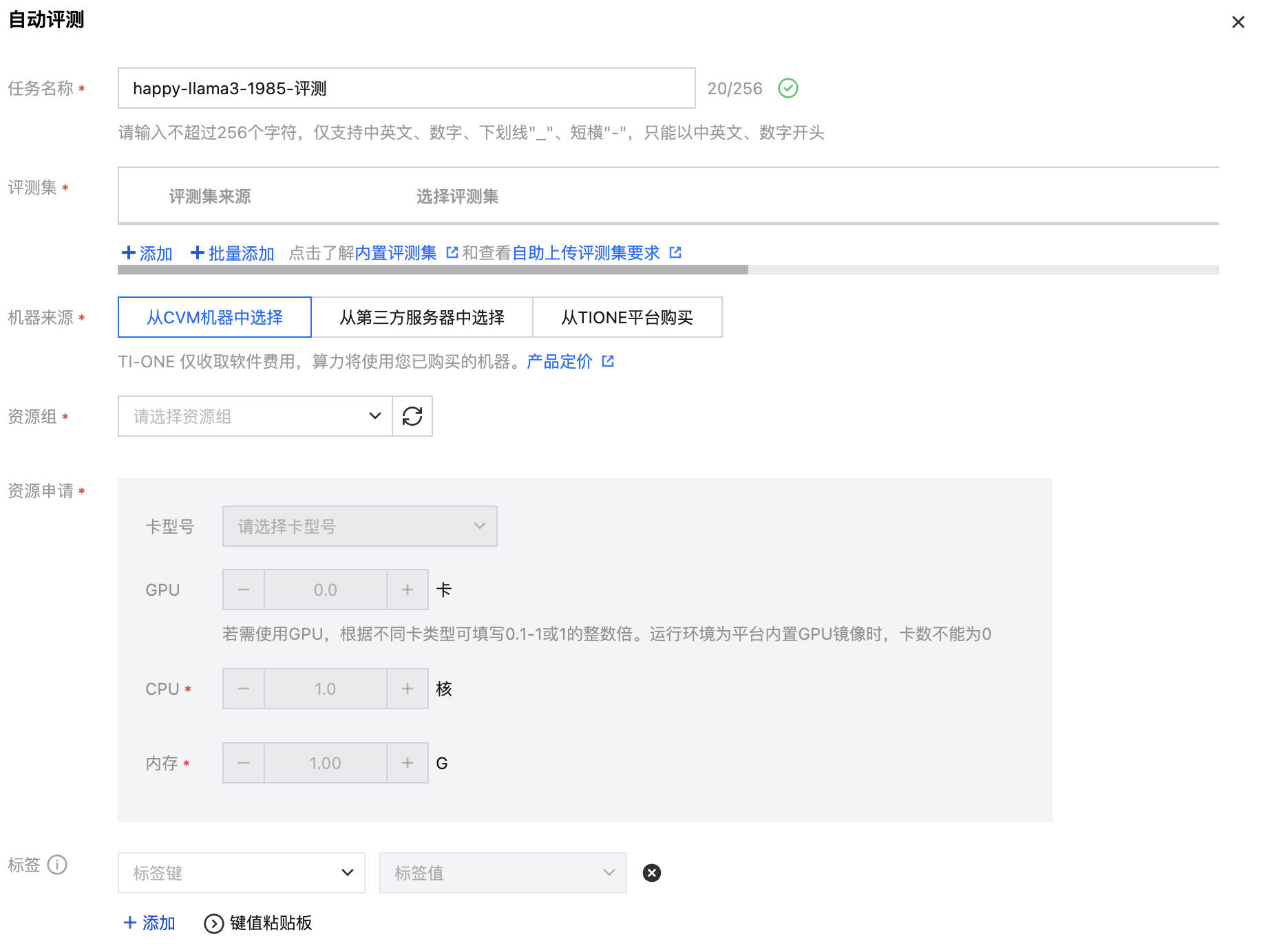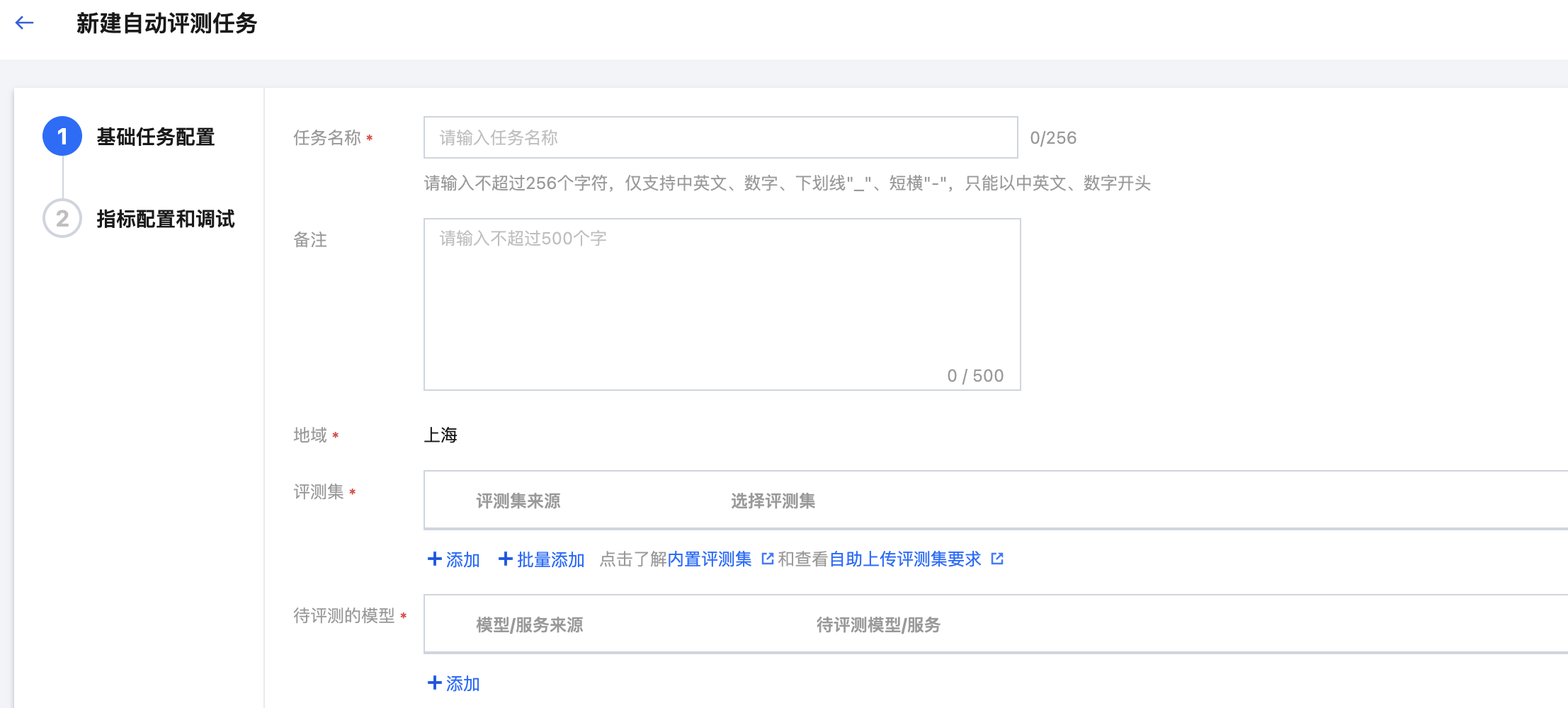 任务名称 | 自动评测任务的名称,按照界面提示的规则填写即可。 |