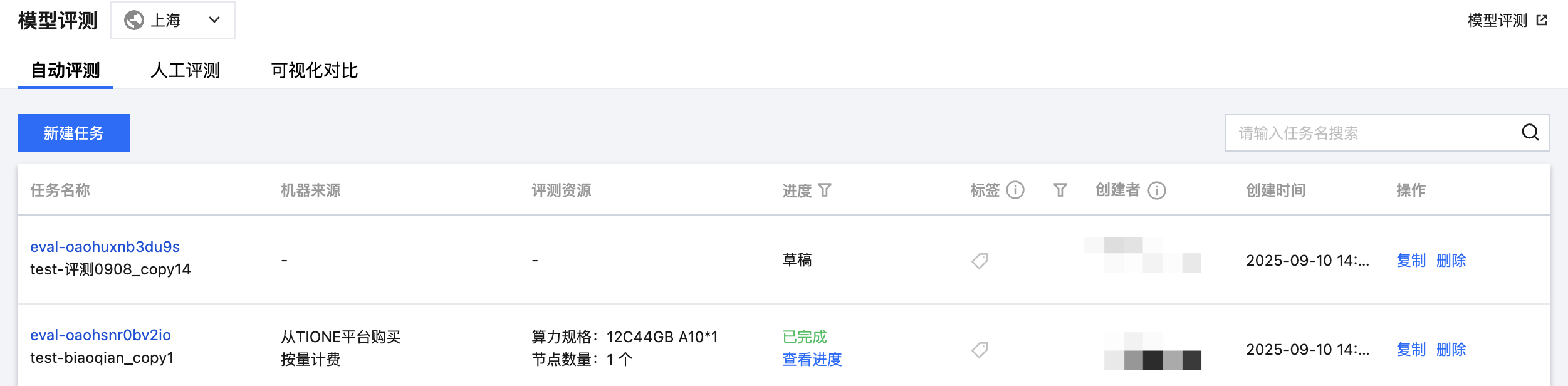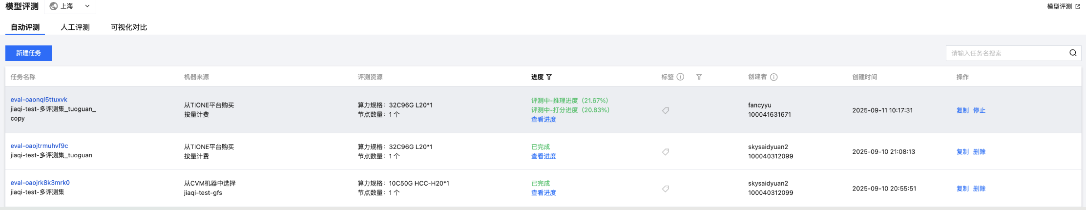 填写完以上信息后,点击完成开启评测任务。评测任务新建成功后,会在任务列表页展示:任务名称、机器来源、评测资源、进度、标签、创建者、创建时间、操作(停止、重启、删除、复制)。