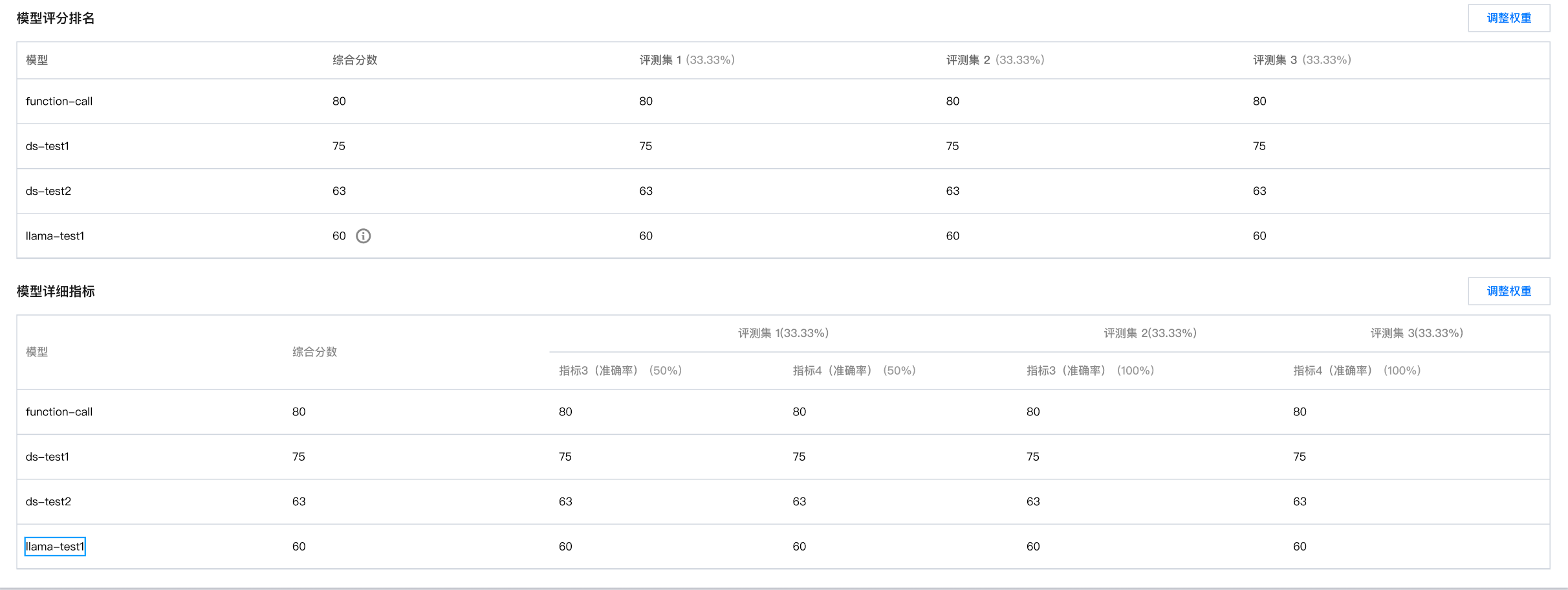 支持查看模型的综合分数和评分排名,以及对每个模型的详细指标进行查看。用户可单击“调整权重”按钮对评测集的权重和指标的权重。