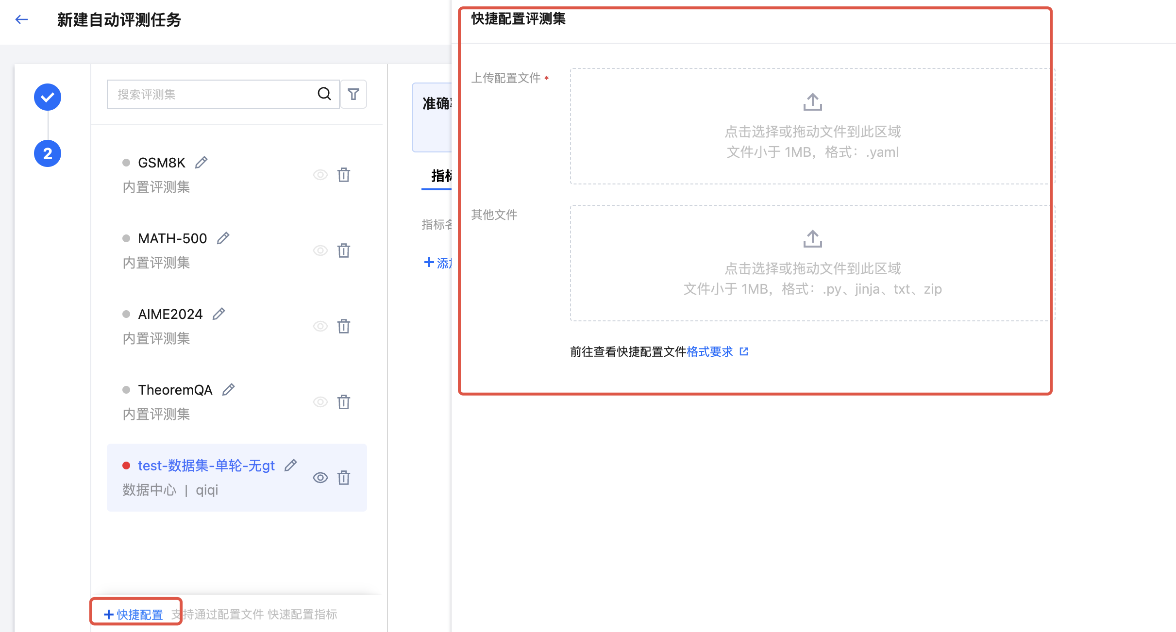 支持通过“快捷配置”高效完成评测指标的配置,“快捷配置”时需要上传文件,文件中需包含评测集、评测集对应的指标名称、每个指标名称对应的详细配置信息(如裁判模型信息、打分 Prompt、前后处理脚本等)。用户点击“快捷配置”按钮,上传自定义 YAML 配置文件以及需引用的文件,上传完毕后单击“应用”按钮,平台将自动根据用户填写的评测集名称对应在 YAML 配置文件中的指标、以及指标的配置信息在页面进行自动填充。快捷配置文件上传指南请参见 指标快捷配置文件规范。