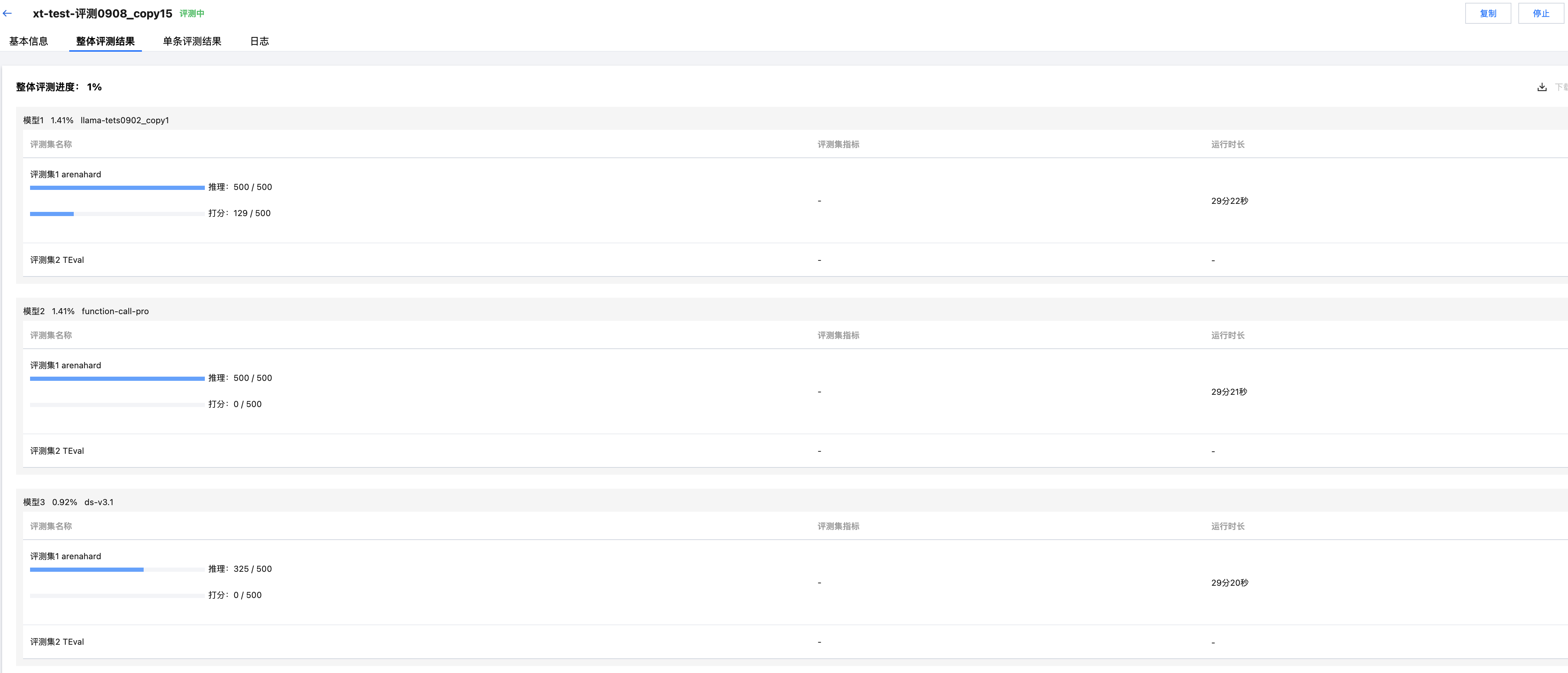 单击整体评测结果 tab 页面,支持对整体评测的详细进度和最终评测结果进行查看。