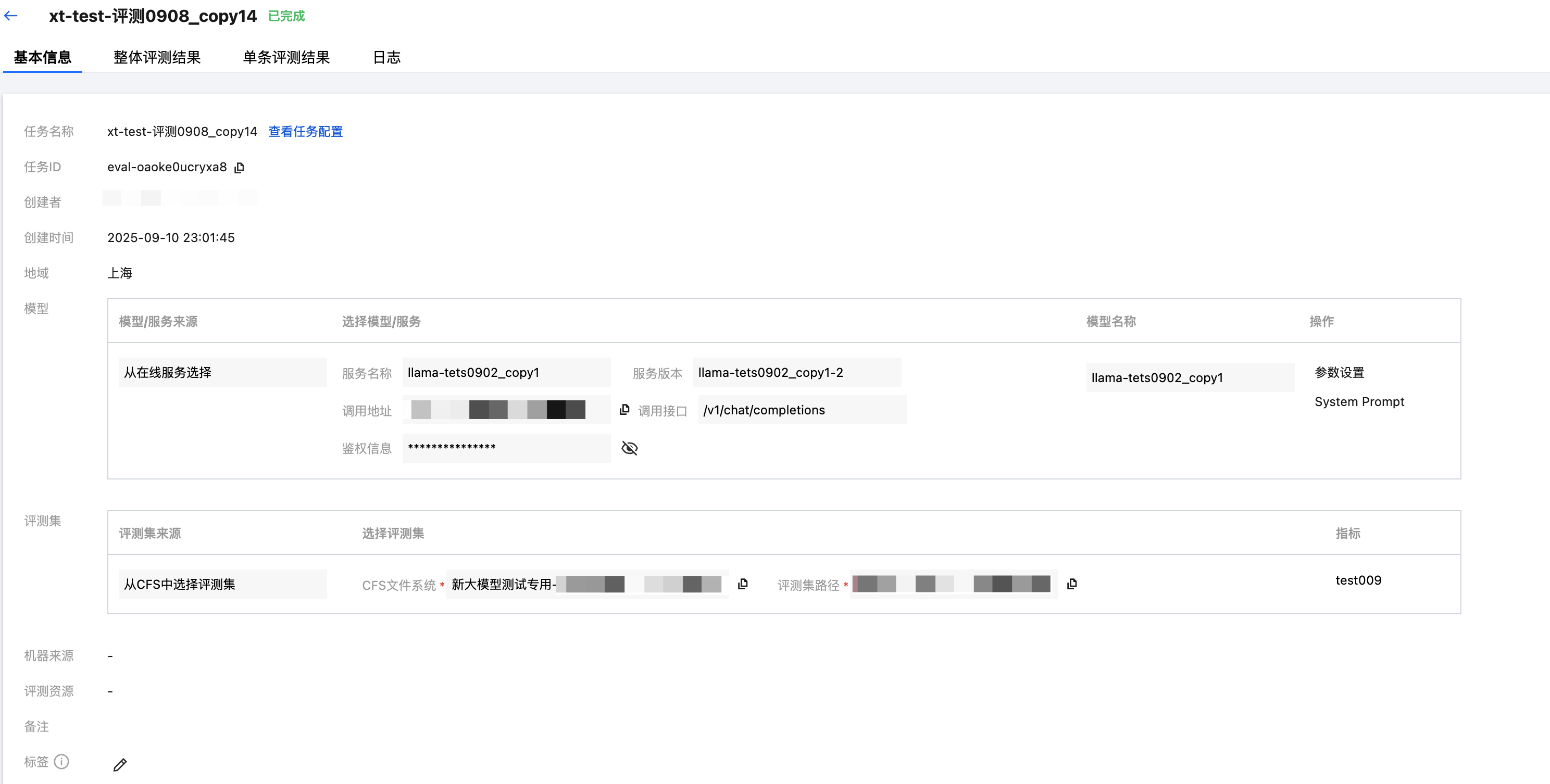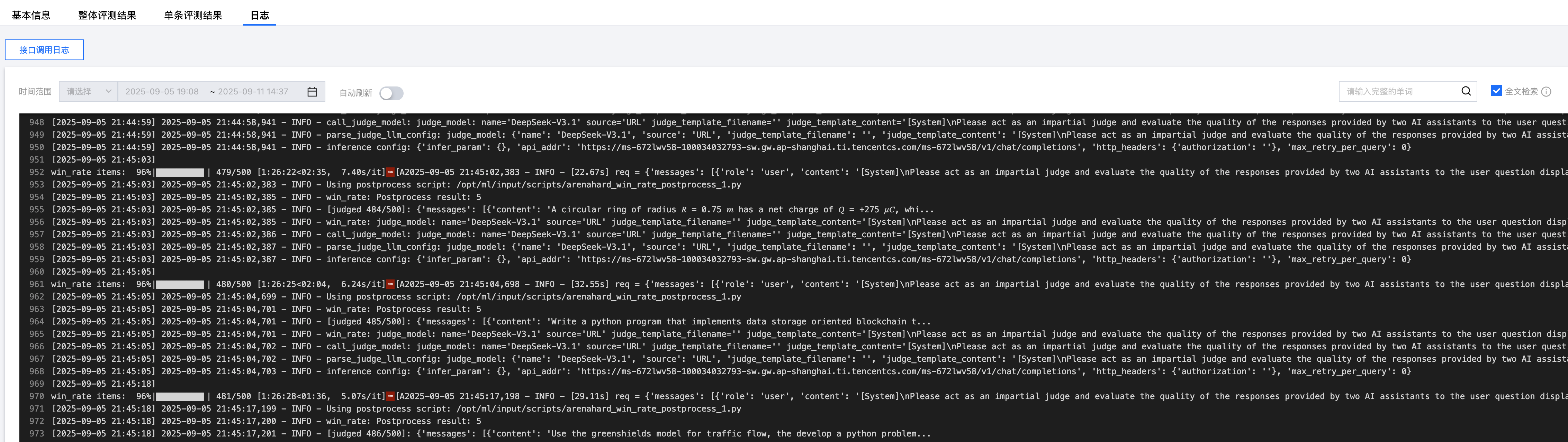 在自动评测列表页面点击评测任务 ID 可进入任务详情查看,支持对基本信息、整体评测结果、单条评测结果、日志进行查看。