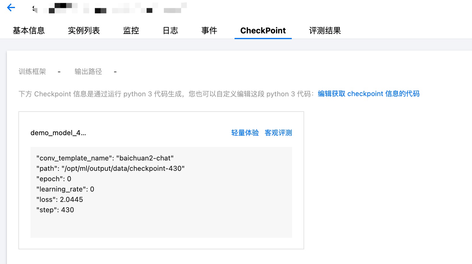 概述:登录 TI-ONE 控制台,在左侧导航栏中选择训练工坊 > 任务式建模,进入任务列表页面。 在任务页面单击训练的任务名称,进入任务详情页面。使用此入口的前提条件为需已完成 任务式建模 的任务创建,已完成 CheckPoint 的输出。