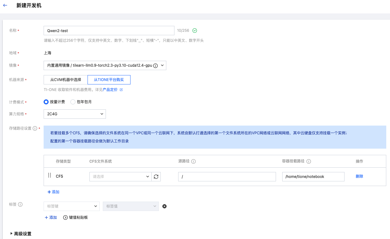 登录腾讯云 TI 平台 训练工坊 > 开发机,单击新建,其中各字段的填写说明如下: