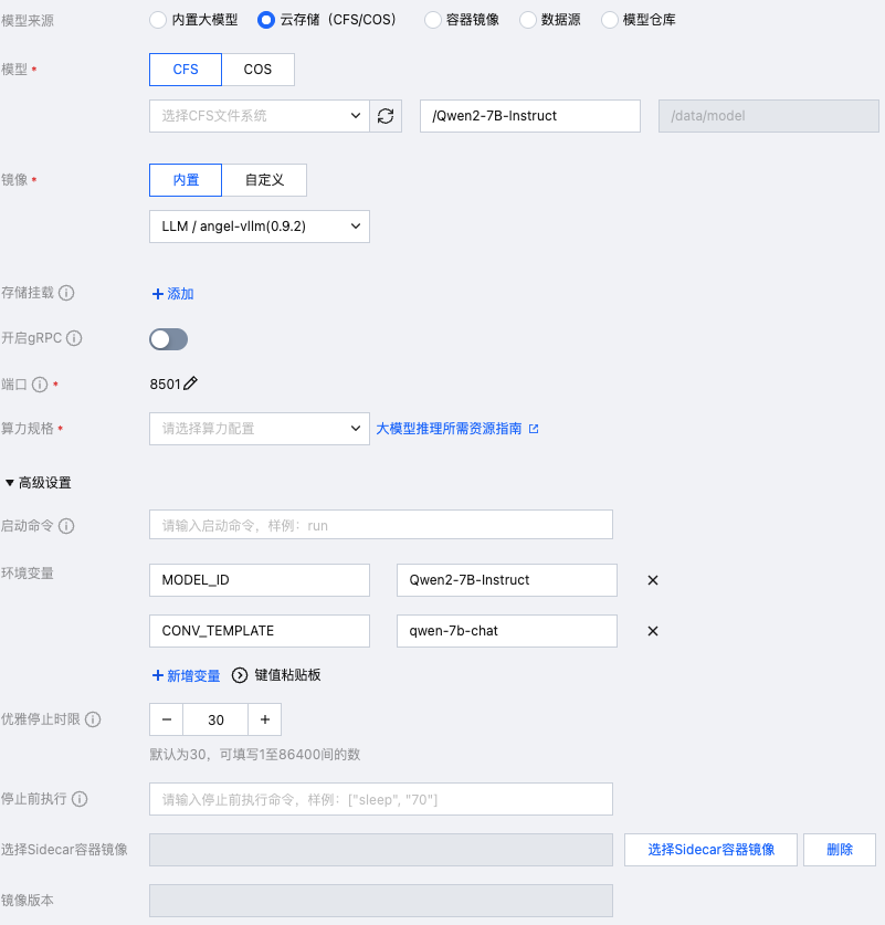 模型:选择 CFS 文件系统中存储的模型文件路径,此处为【/qwen/Qwen2-7B-Instruct】。