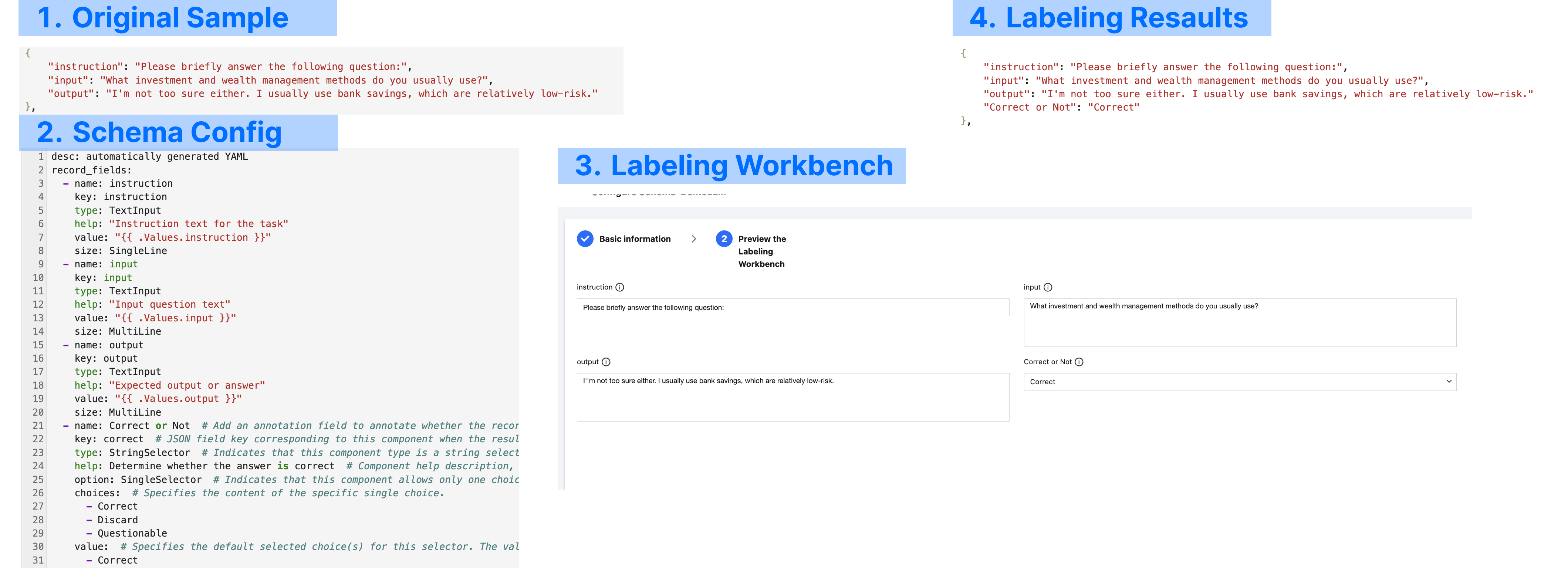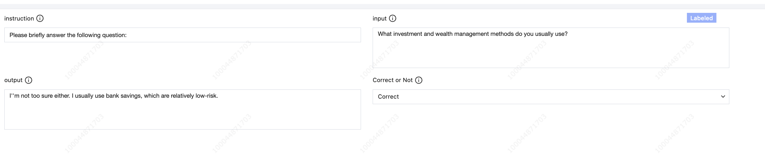 Common labeling in LLM scenarios typically involve labeling single-turn or multi-turn Q&A pairs. Each sample in the raw dataset is a JSON object. Example: