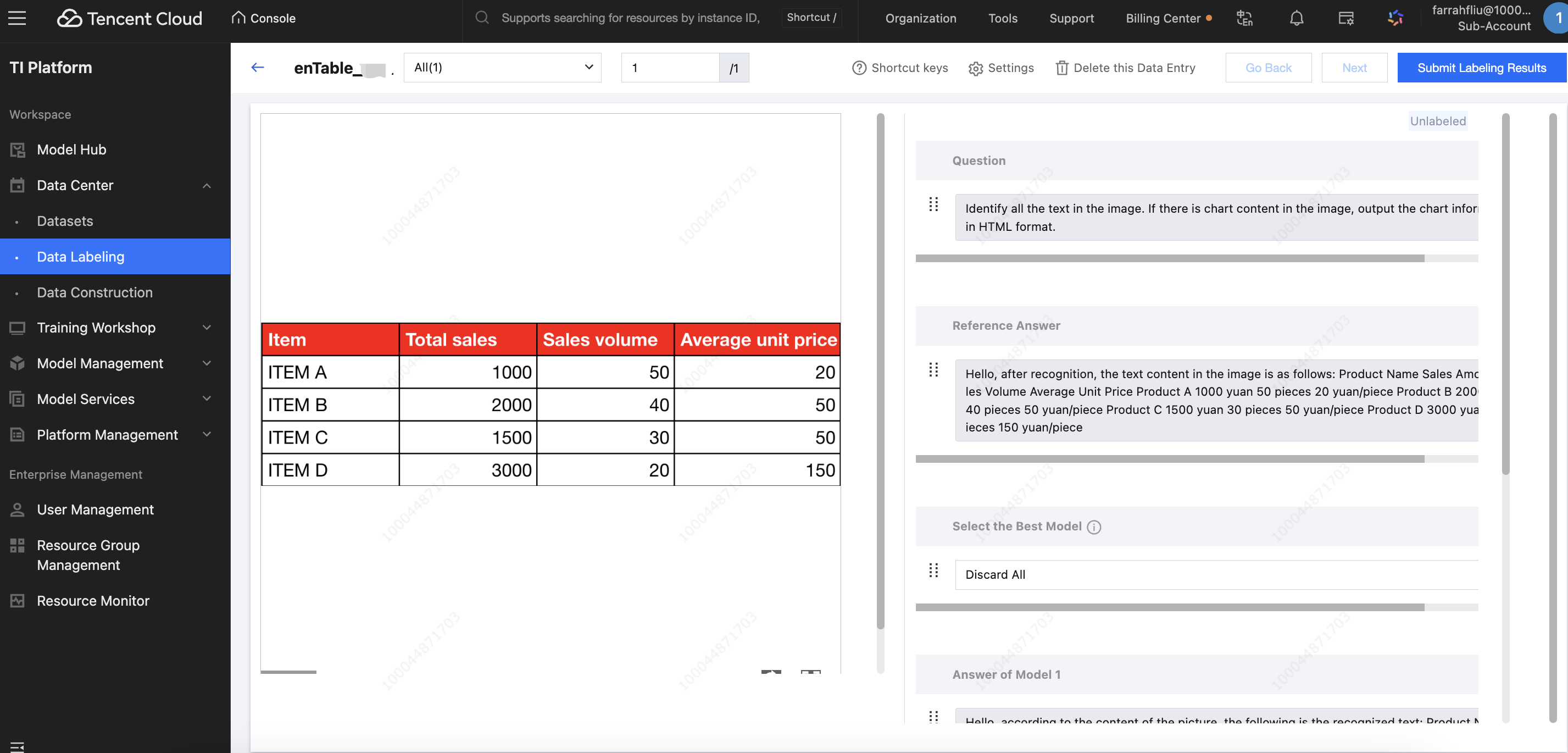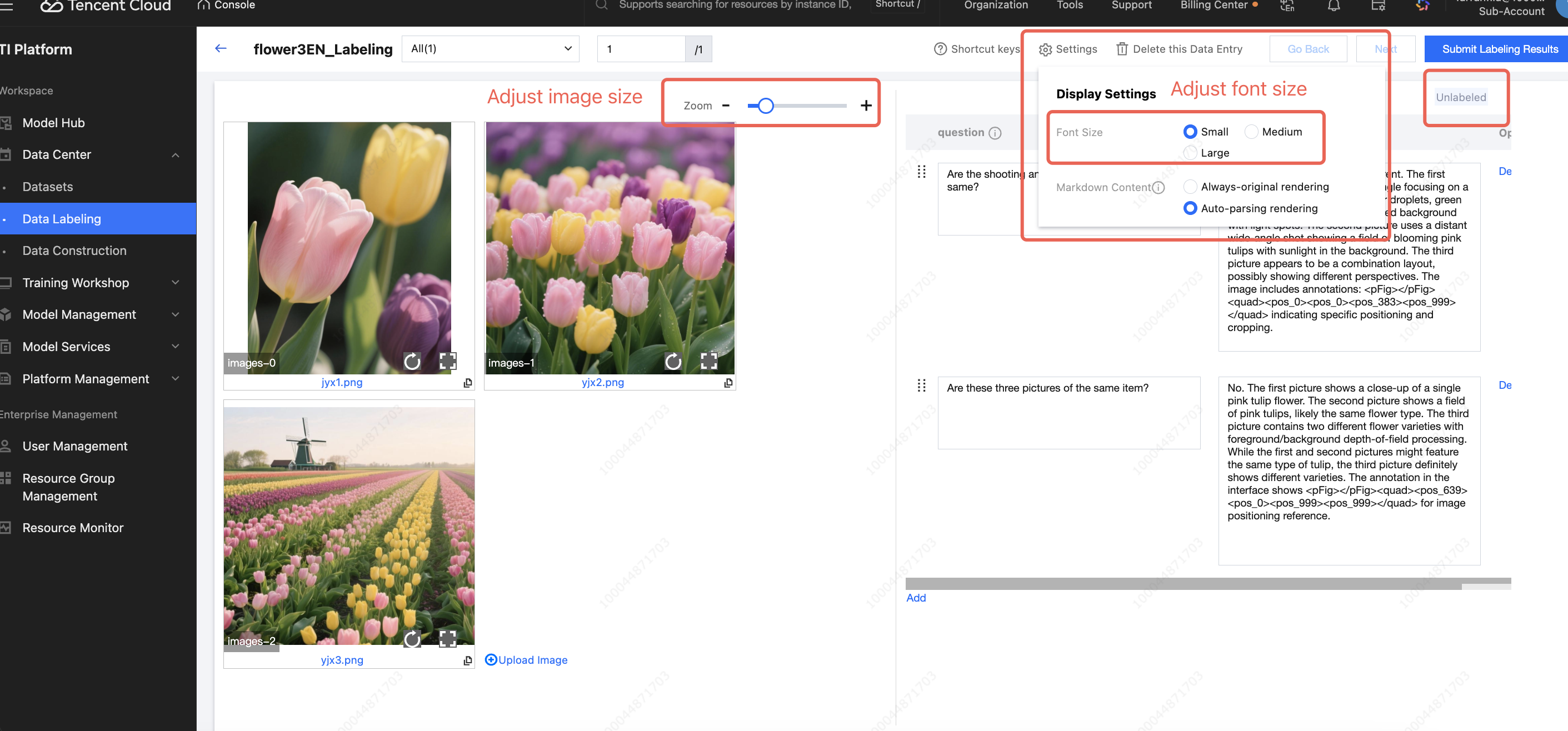 The flexible schema configurations of TI-ONE support labeling scenarios, including but not limited to: filtering of high-quality text Q&A pairs, text data cleansing, reviewing or modification of image Q&A pairs, evaluation of image Q&A competitors, image multi-turn Q&A, and multimodal reading comprehension for image text descriptions.