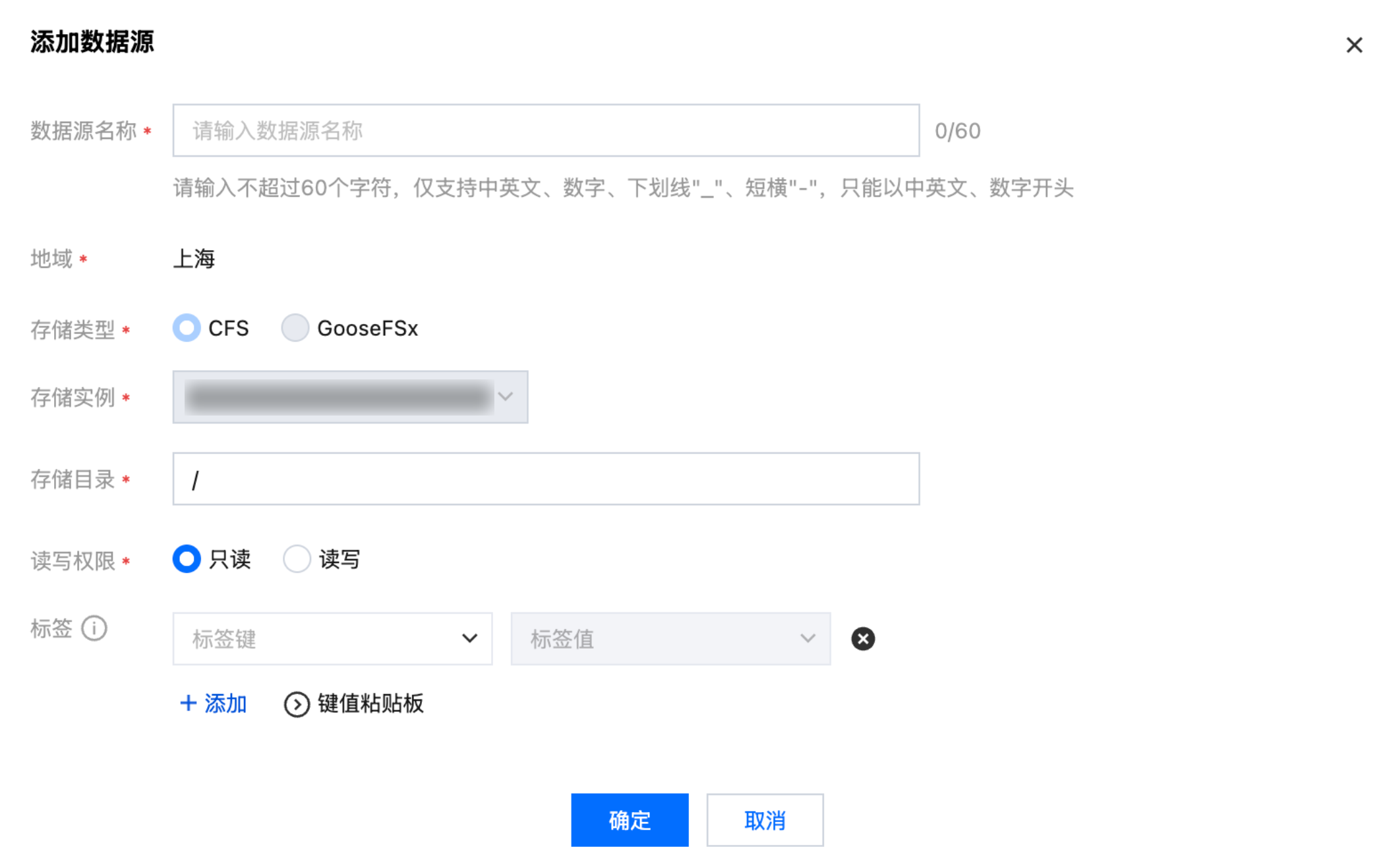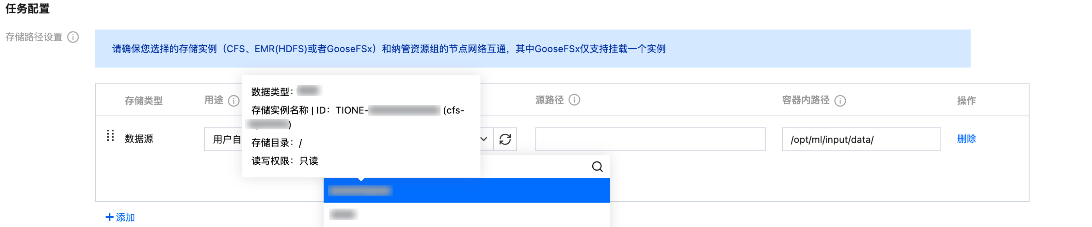 存储实例 | 1. 必选,选项来源为对应存储类型下,已购买的存储实例信息。(备注:括号外表示存储实例的名称,括号内表示存储实例ID) 2. 注意:此处的实例是指腾讯云上已购买的存储实例,TI-ONE 只是注册和绑定,并非单独创建一个实例。 |