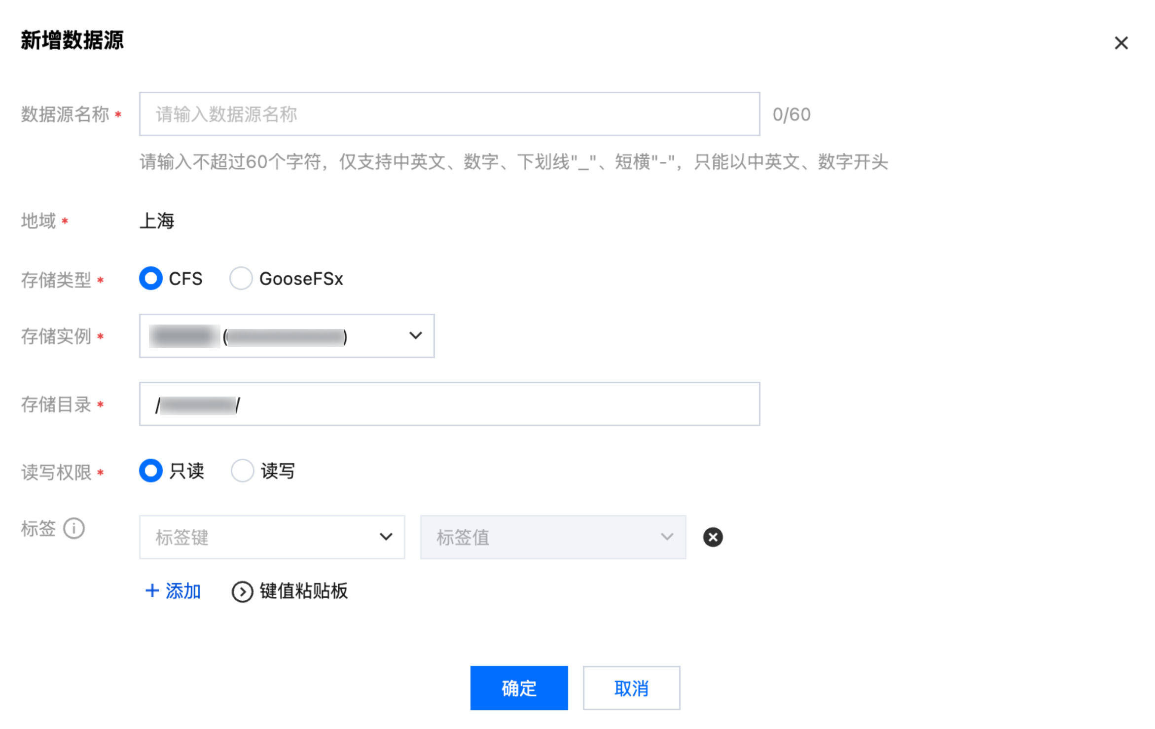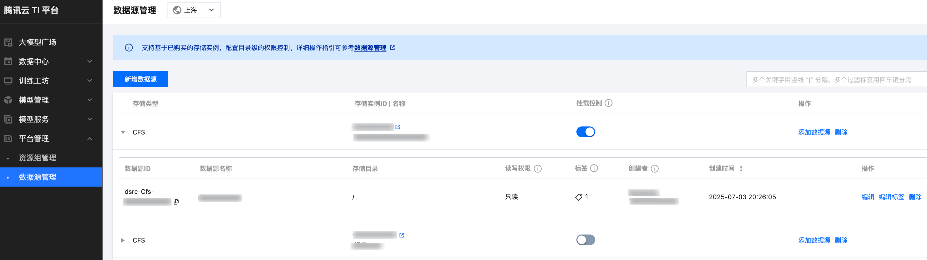 新建数据源:支持将腾讯云上已购买的存储实例注册至 TI-ONE 平台,并将指定目录创建为数据源。