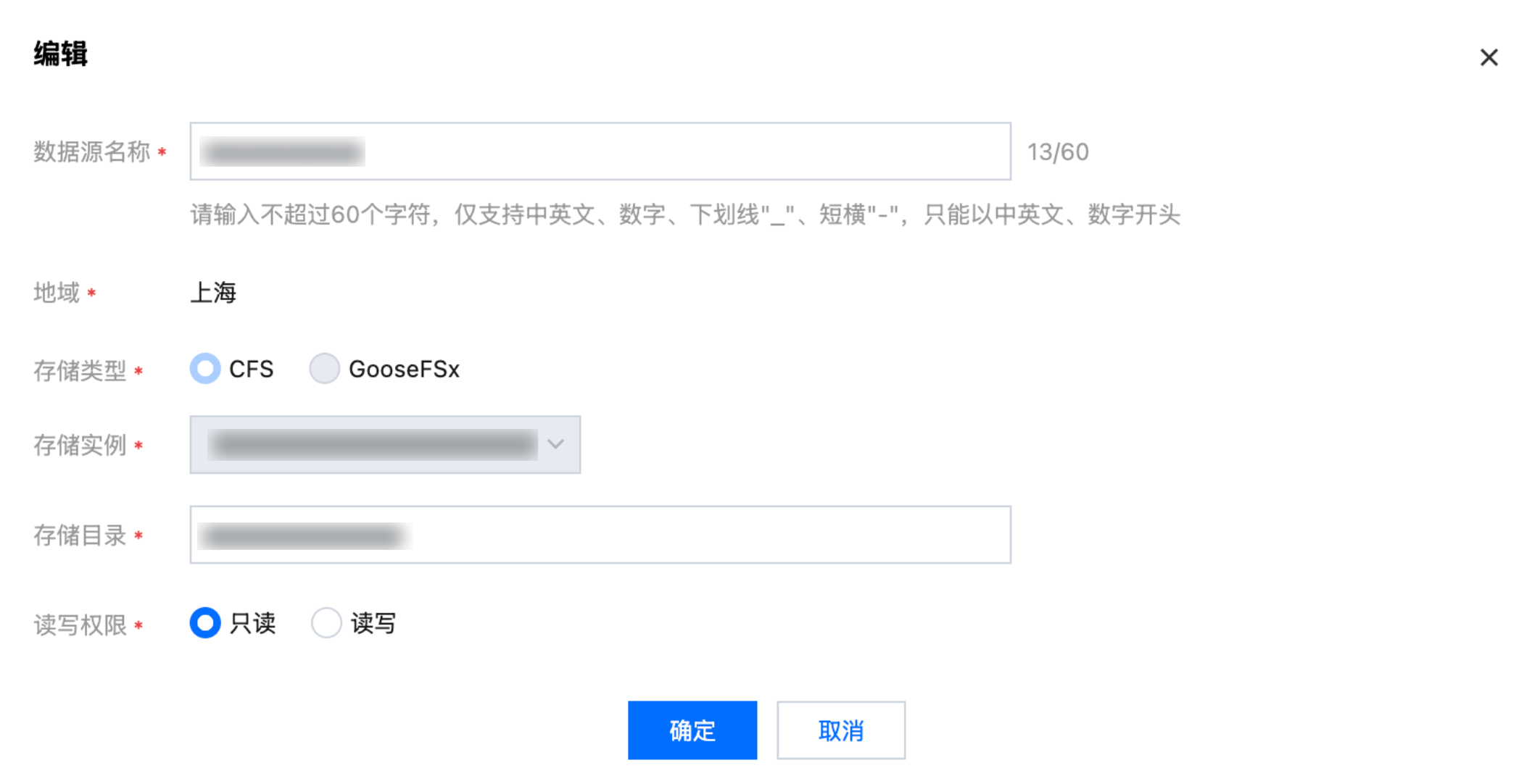 与新增数据源的配置参数一致,编辑时将回填已有信息,支持修改“名称/存储目录/读写权限”。不可修改存储实例的类型和名称/ID。
