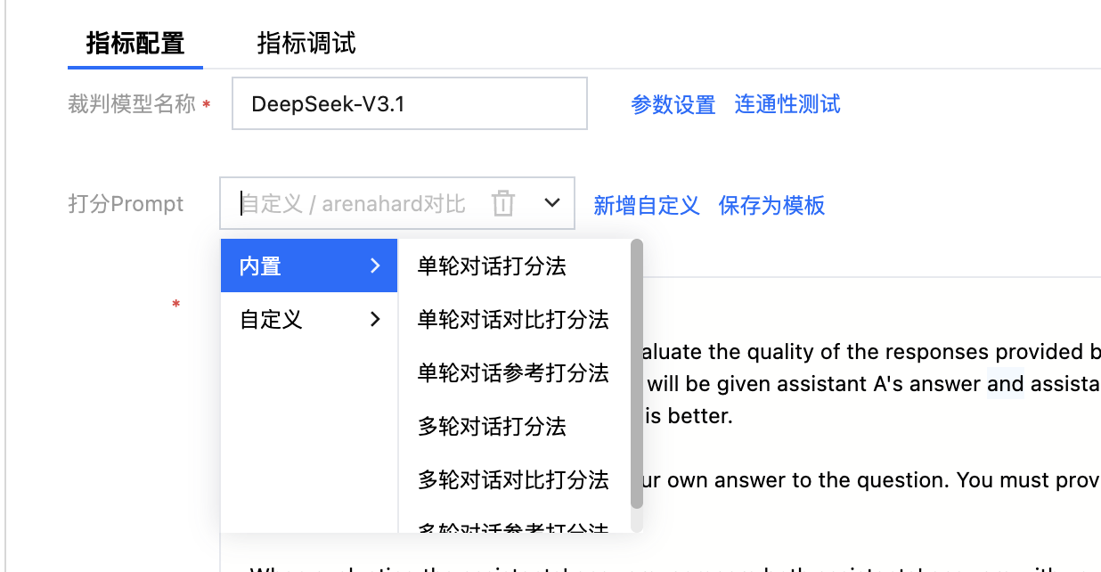 概述:为提高用户配置效率,平台内置单轮、多轮对话打分 prompt 模板,以及提供对应的后处理方式。