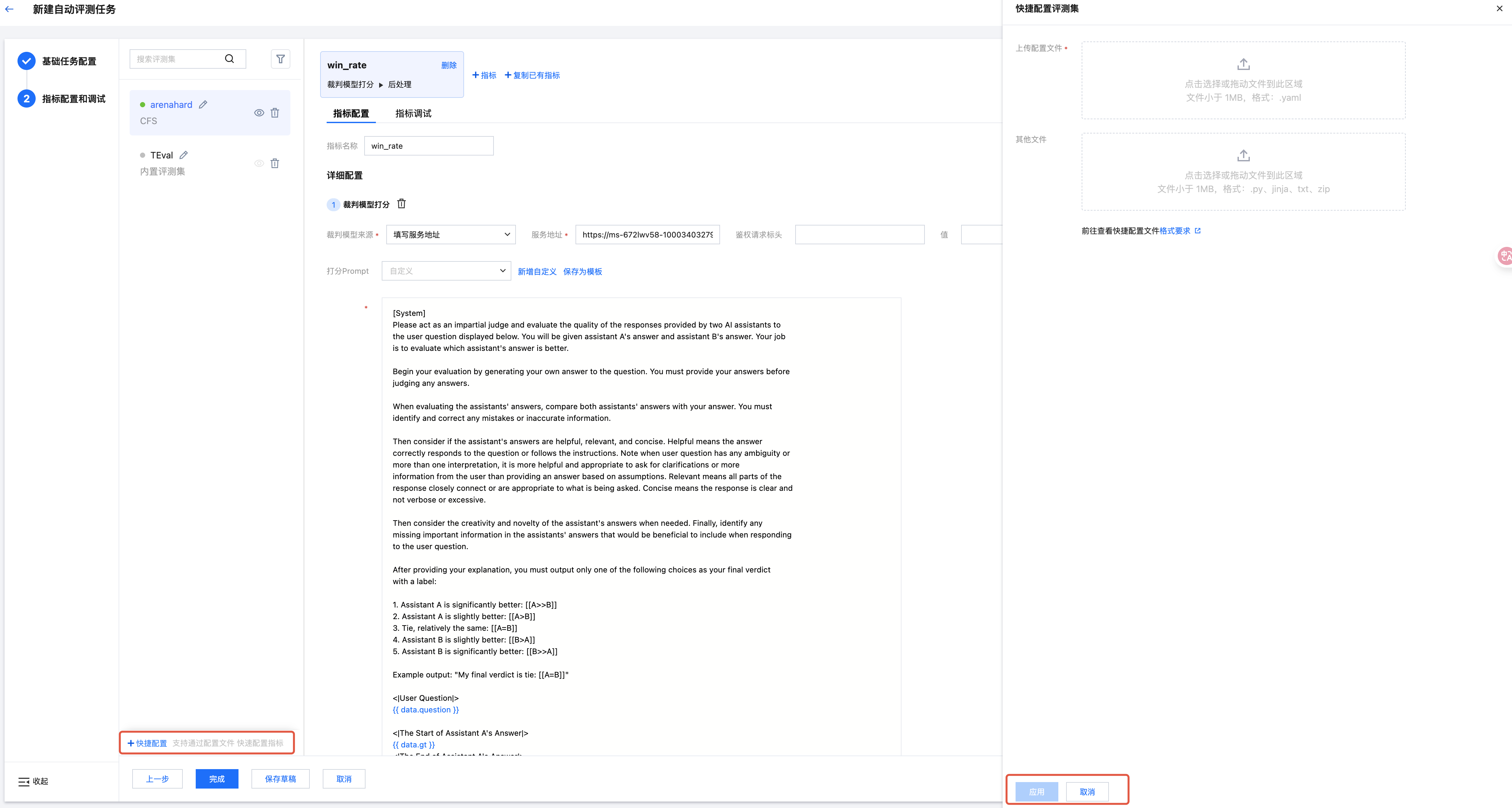 用户在自动评测页面配置指标时,可通过上传文件进行指标的快捷配置。文件中需包含评测集、评测集对应的指标名称、每个指标名称对应的详细配置信息(如裁判模型信息、打分 Prompt、前后处理脚本等)。用户单击快捷配置按钮,上传自定义 YAML 配置文件以及需引用的文件,上传完毕后单击应用按钮,平台将自动根据用户填写的评测集名称对应在 YAML 配置文件中的指标、以及指标的配置信息在页面进行自动填充。