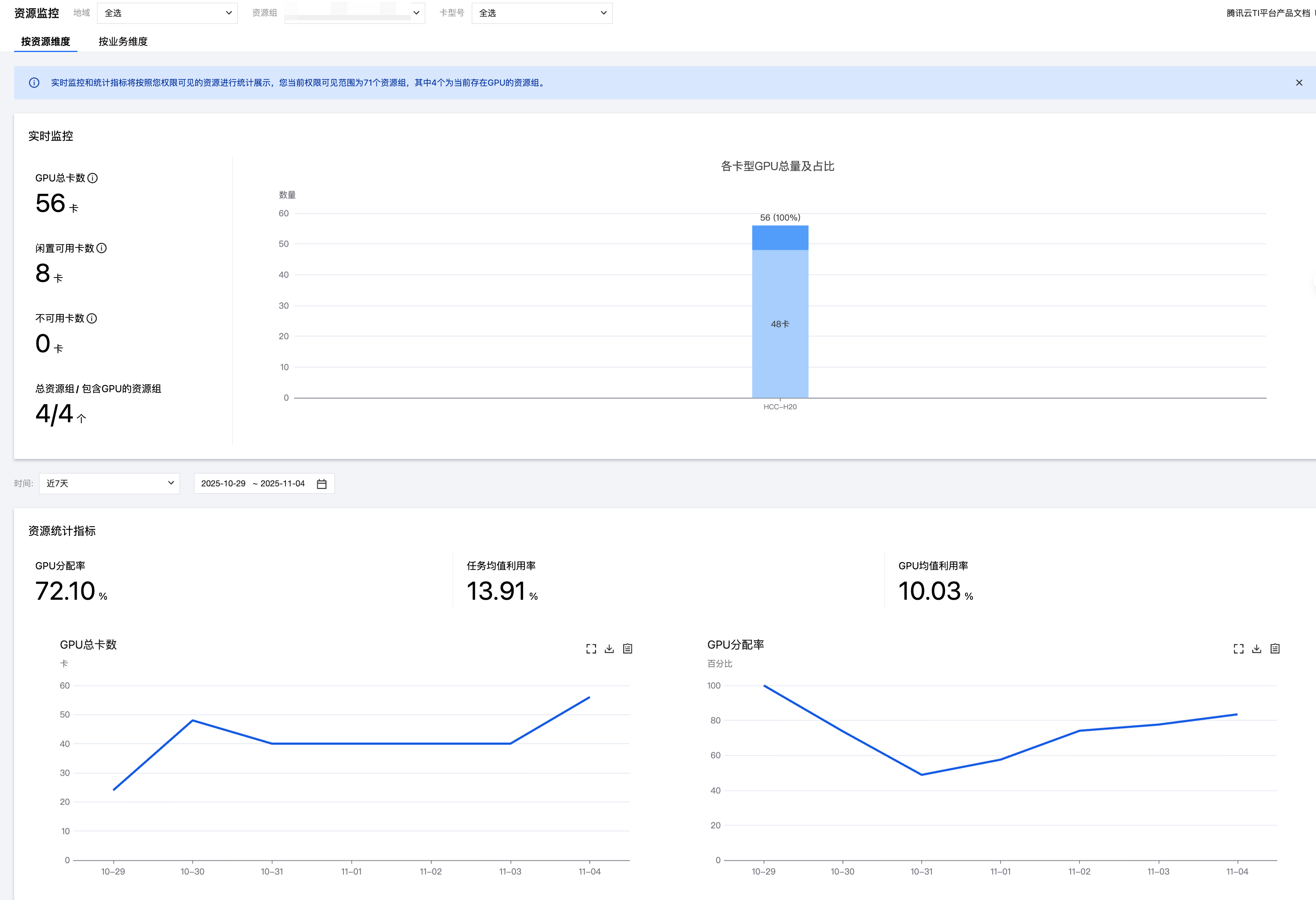 GPU 总卡数 | 统计的范围为当前资源组中包含的卡,包含包年包月、按量计费以及资源组节点完成部署后的卡 |