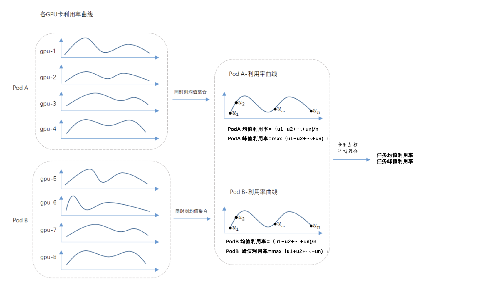 每个任务通过先计算单 pod 的 GPU 利用率,不同pod之间通过卡时加权得到任务的平均利用率和峰值利用率。
