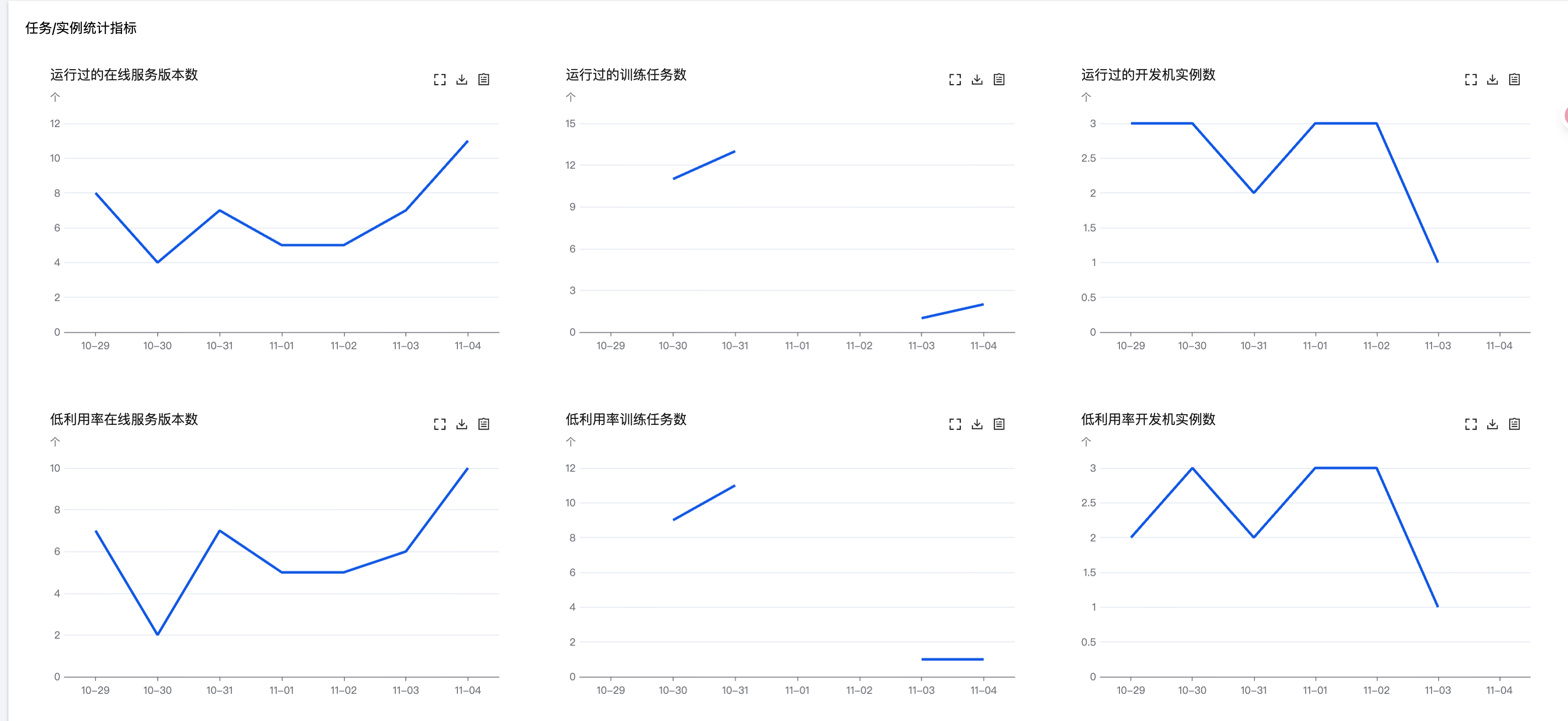低利用率开发机实例数 | 统计周期内运行过的单任务 GPU 利用率低于50%时的任务数趋势图 |