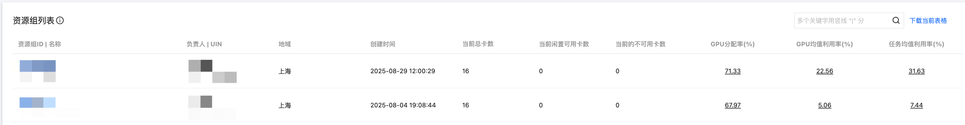 总资源组/包含 GPU 的资源组 | 总资源组包含用户权限可见的全部资源组 |