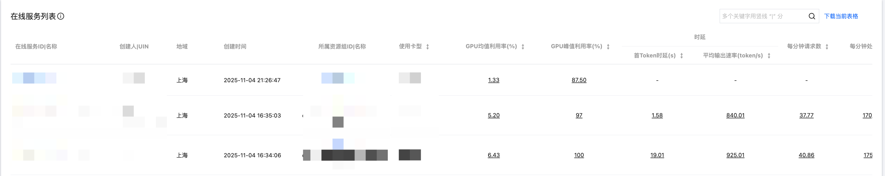 GPU峰值利用率 | 统计周期内,通过单实例 GPU 实际使用 max 利用率卡时加权后除以总 GPU 卡时后获得,具体计算公式详见“核心指标说明”标题的“资源组任务利用率/GPU利用率/分配率”(健康监测任务暂未纳入统计) |