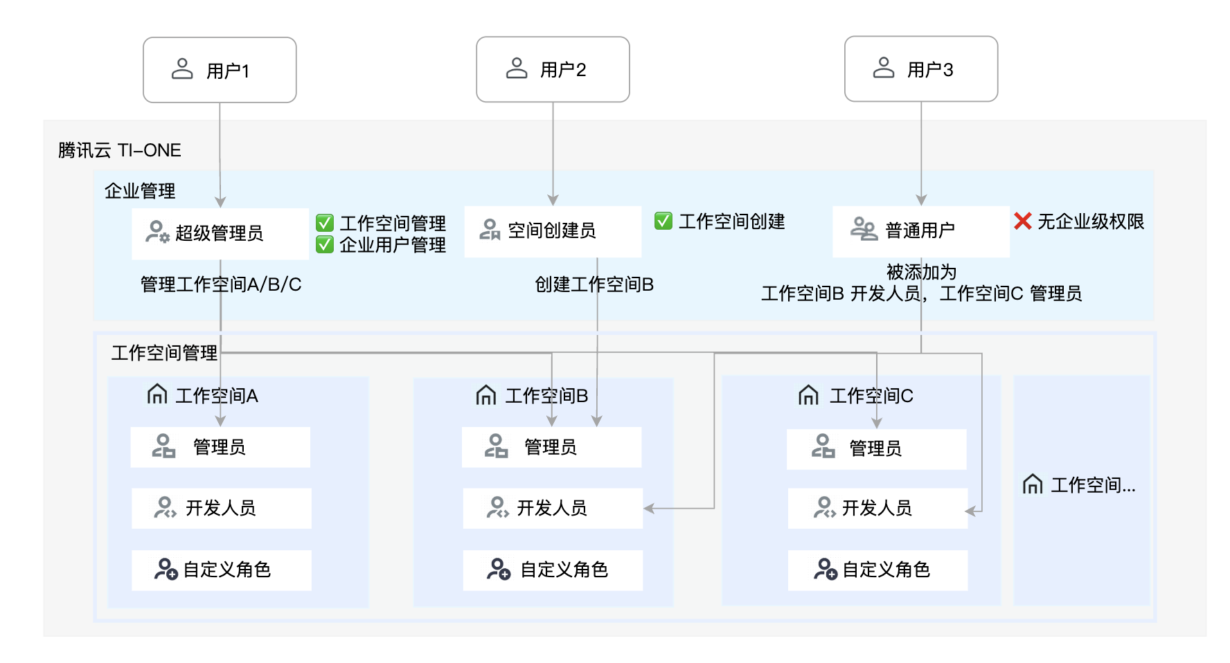 TI-ONE 的权限管理,采用如下图所示的“企业-工作空间”两层权限体系: