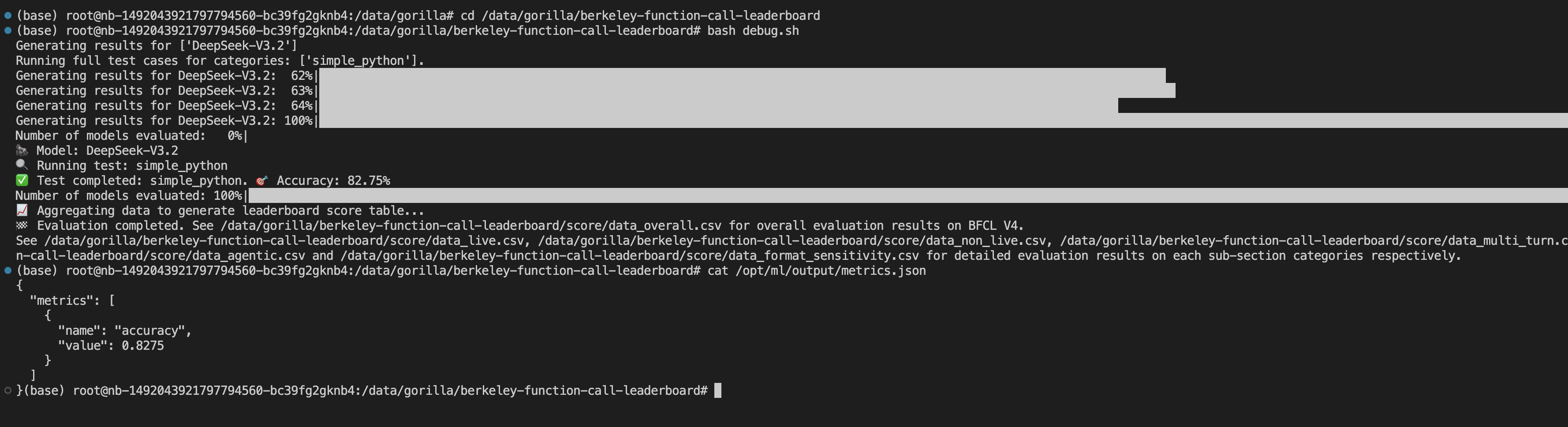 # save_metric.pyimport jsonimport os# 获取输出目录output_dir = os.getenv("EVAL_OUTPUT_DIR")model_name = os.getenv("MODEL_NAME")# 构造结果数据original_result_file = os.path.join("score", model_name, "non_live", "BFCL_v4_simple_python_score.json")with open(original_result_file) as f:first_line = f.readline().strip()original_result = json.loads(first_line)result = {"metrics": [{"name": "accuracy", "value": original_result["accuracy"]},]}# 写入结果文件result_file = os.path.join(output_dir, 'metrics.json')with open(result_file, 'w', encoding='utf-8') as f:json.dump(result, f, indent=2, ensure_ascii=False)