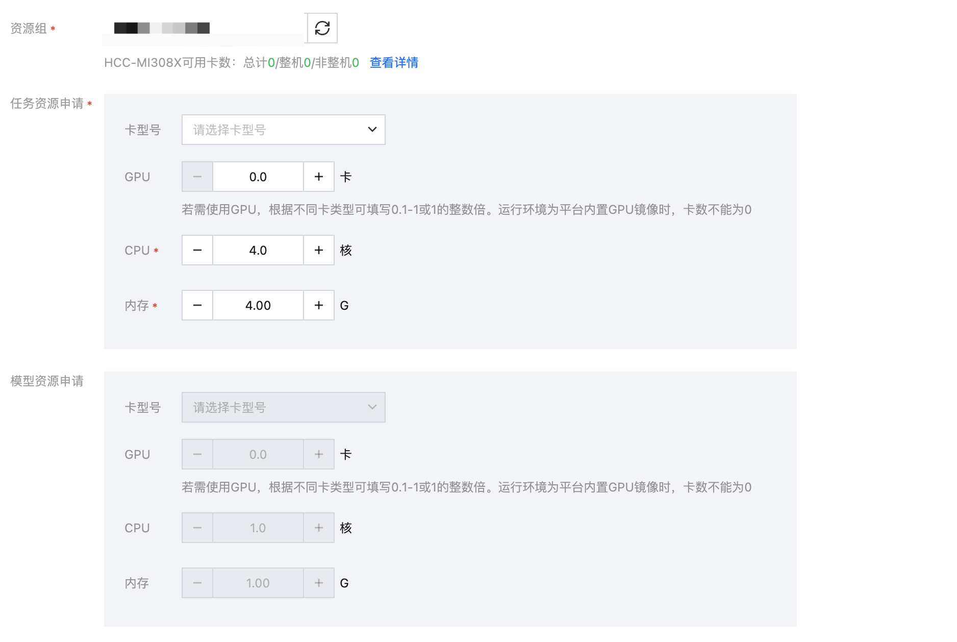 配置资源时,需要申请任务资源和模型资源,任务资源用于运行评测镜像,模型资源用于将模型部署成服务。由于待评测的模型为模型服务,所以本次只需申请任务资源。