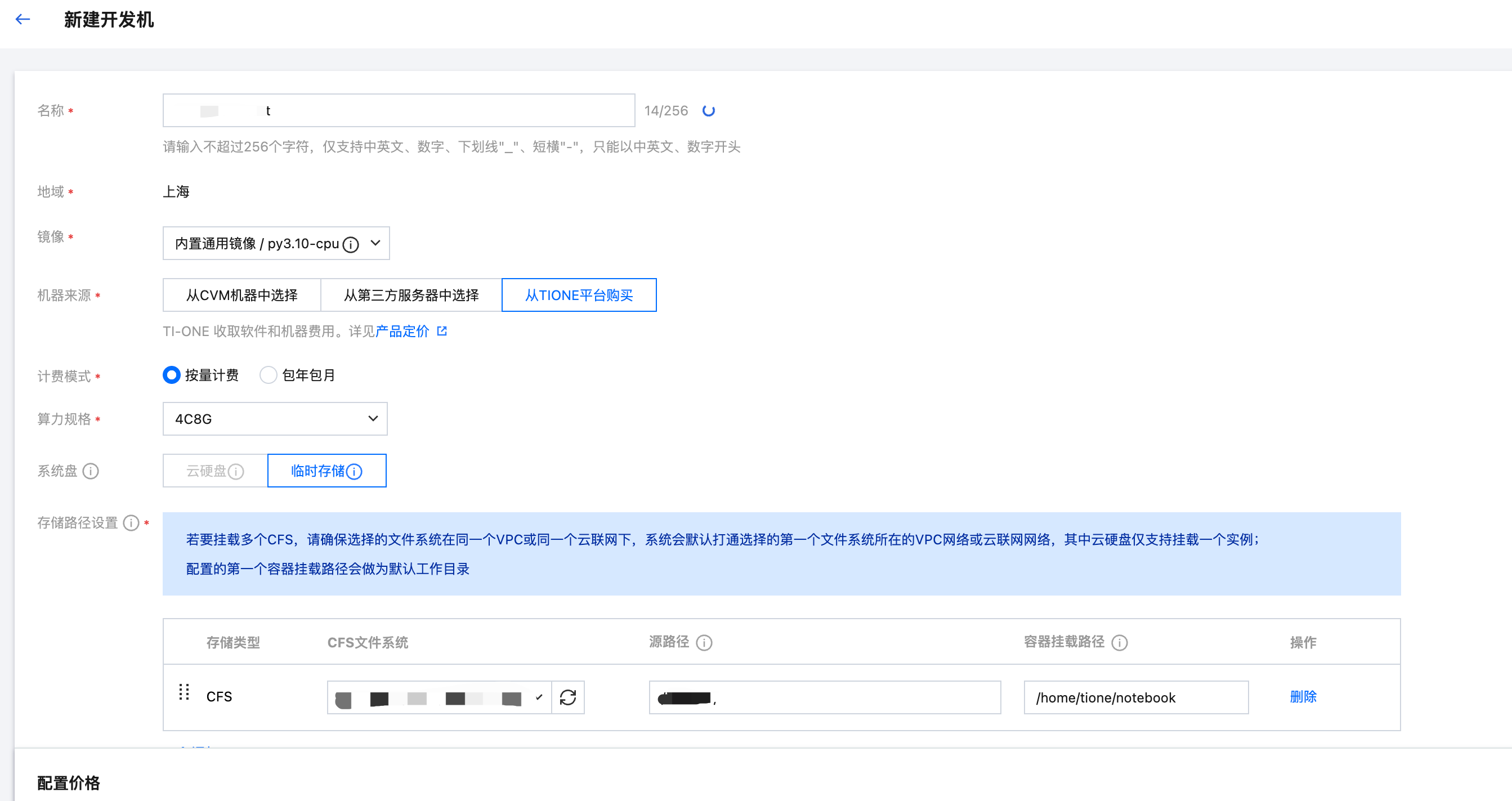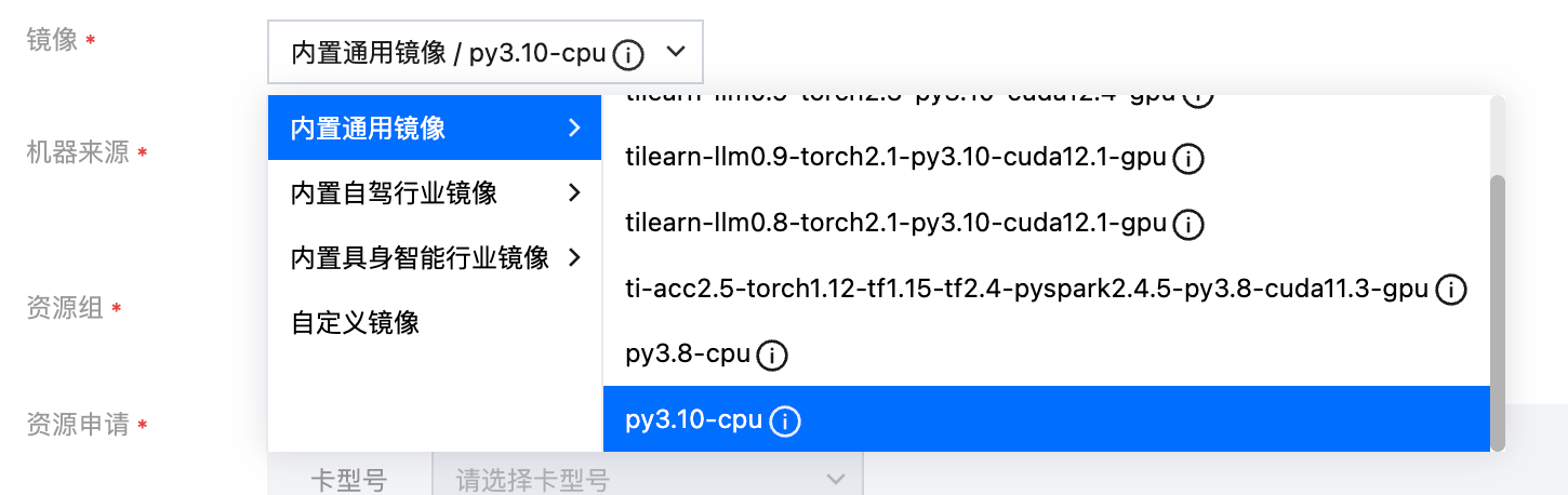 机器来源可选自有的资源组 或者 通过从TIONE平台购买,由于仅制作镜像不需要太多的资源,选择2c4g及以上资源即可。