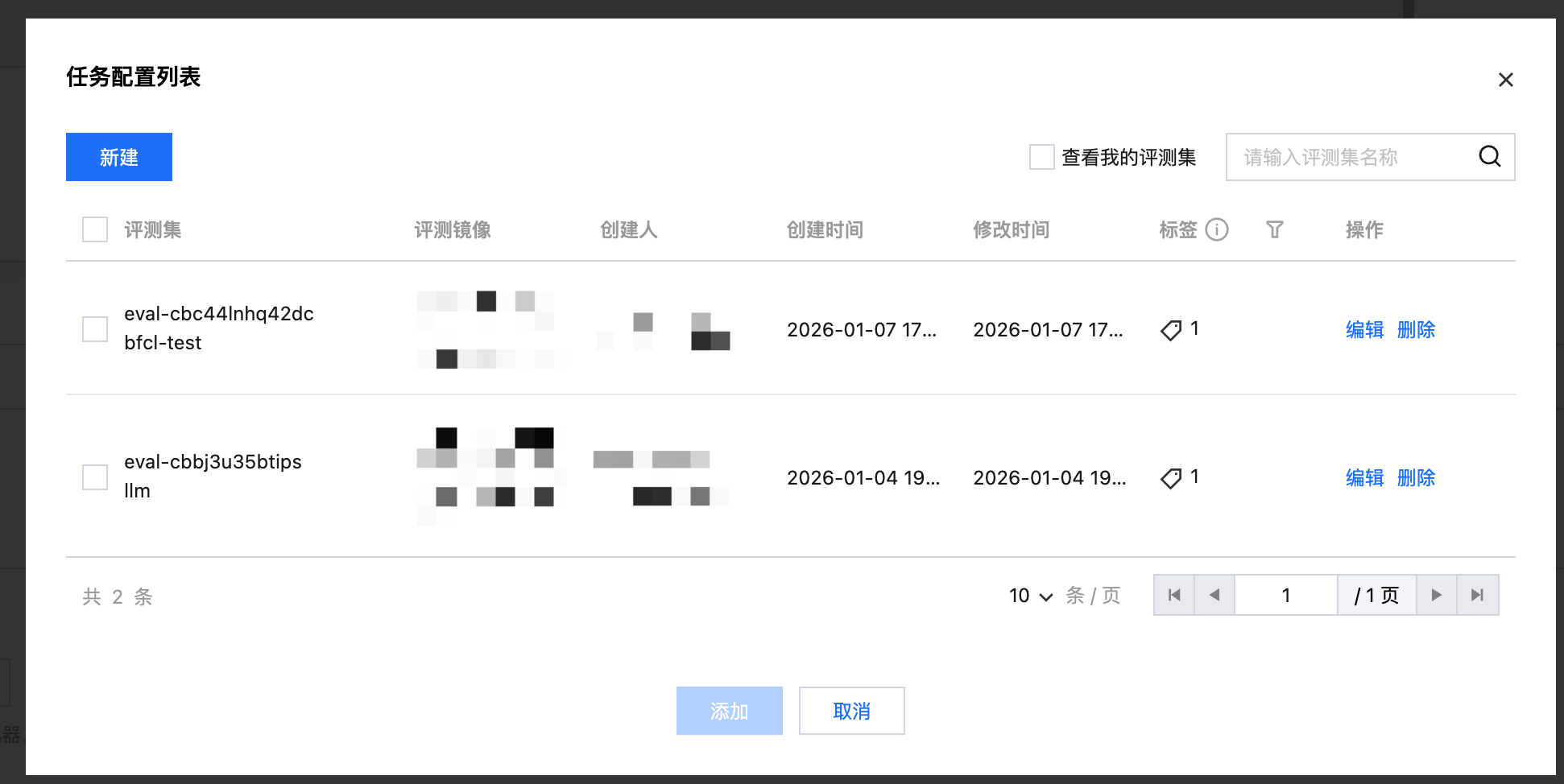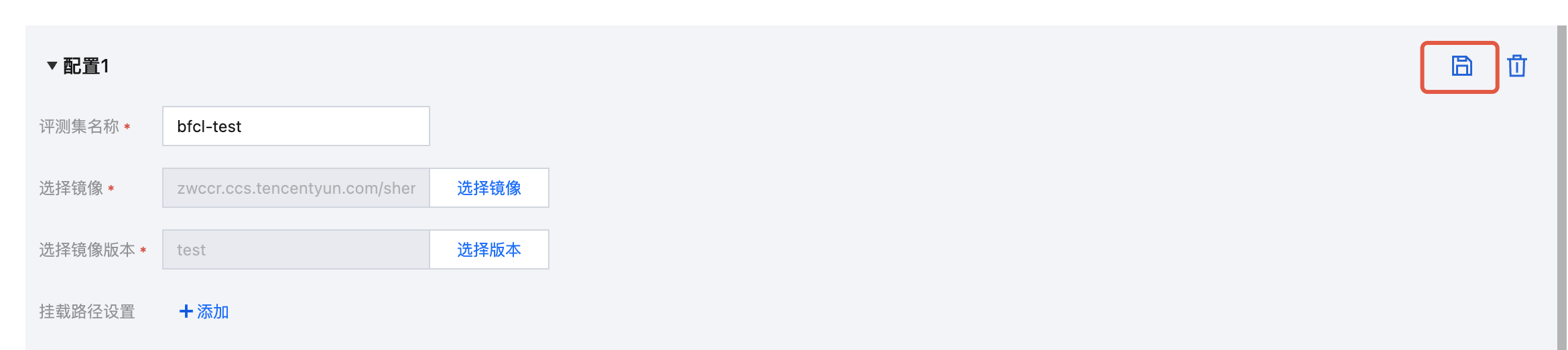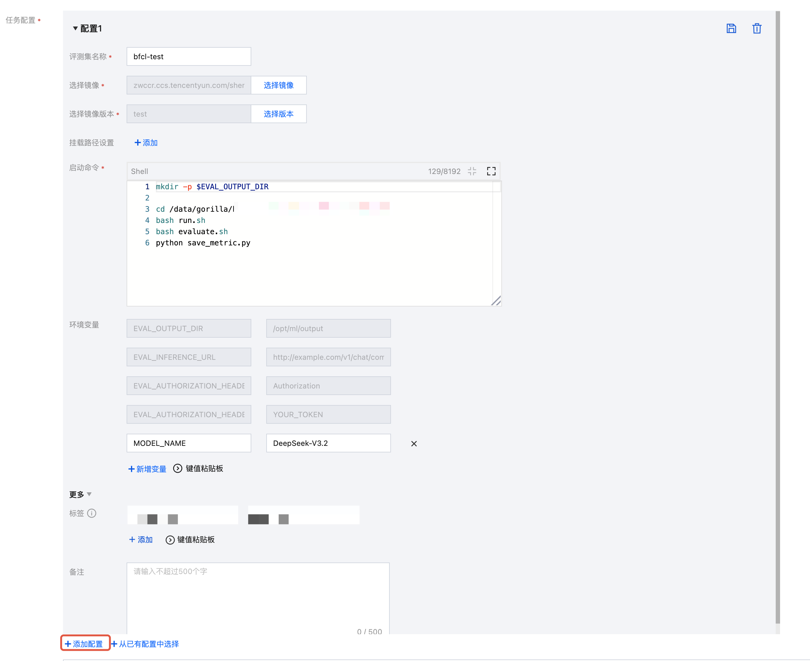 单击 +添加配置,输入评测集名称。选择上述已准备完成的镜像和版本,填写启动命令。