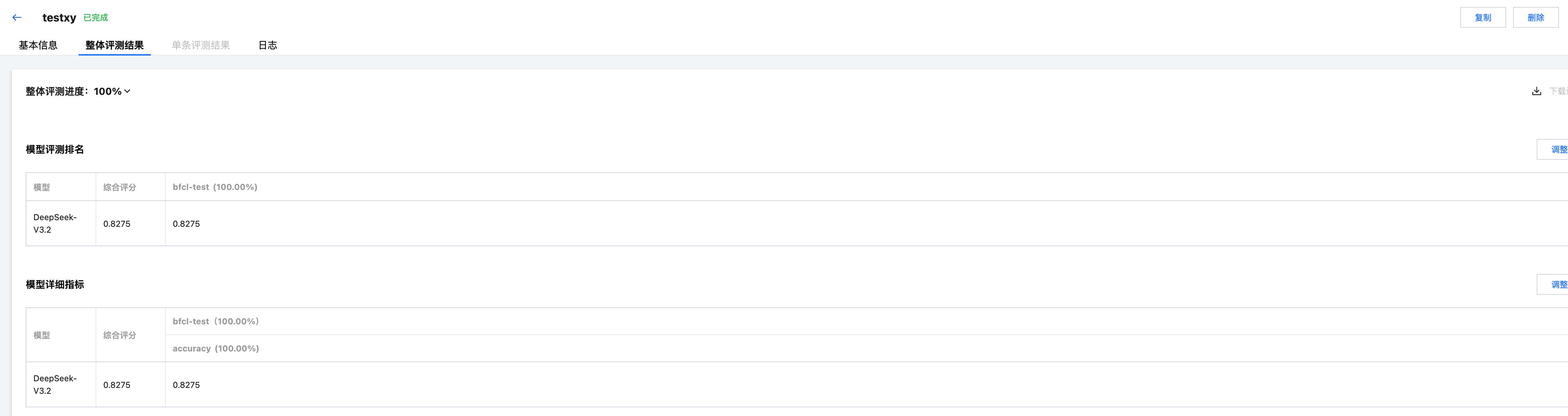 单击 整体评测结果 查看评测结果。