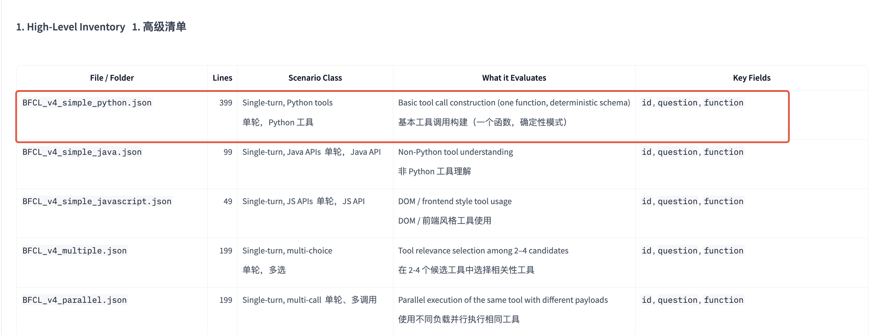 BFCL(Berkeley Function Calling Leaderboard)是首个针对大语言模型(LLM)函数调用与工具使用能力的系统性评估体系。本次选用其中的BFCL_v4_simple_python进行评测,评测DeepSeek-V3.2在此评测集的基础函数调用能力,包含指定函数调用和函数选择调用。