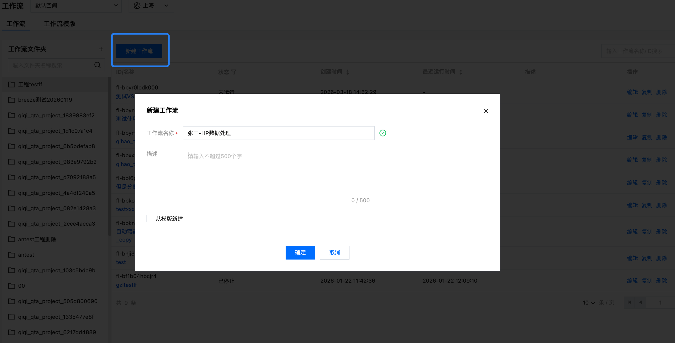 工作流文件夹用于组织和管理您的工作流,您需要先创建文件夹(也可使用其他用户创建好的文件夹)后,再创建工作流。