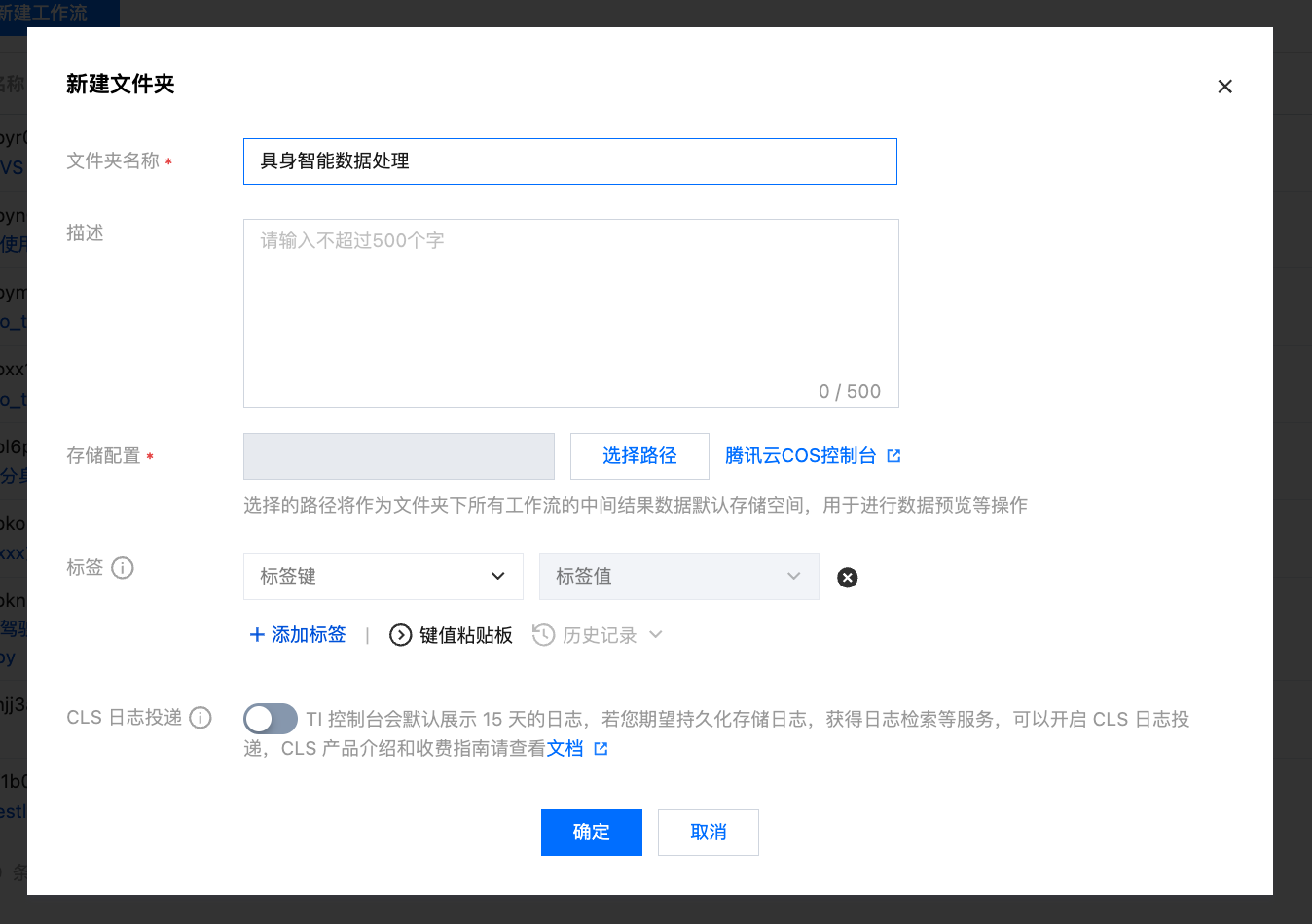 存储配置:填写 COS 路径,用于保存该文件夹下所有工作流的中间结果数据。