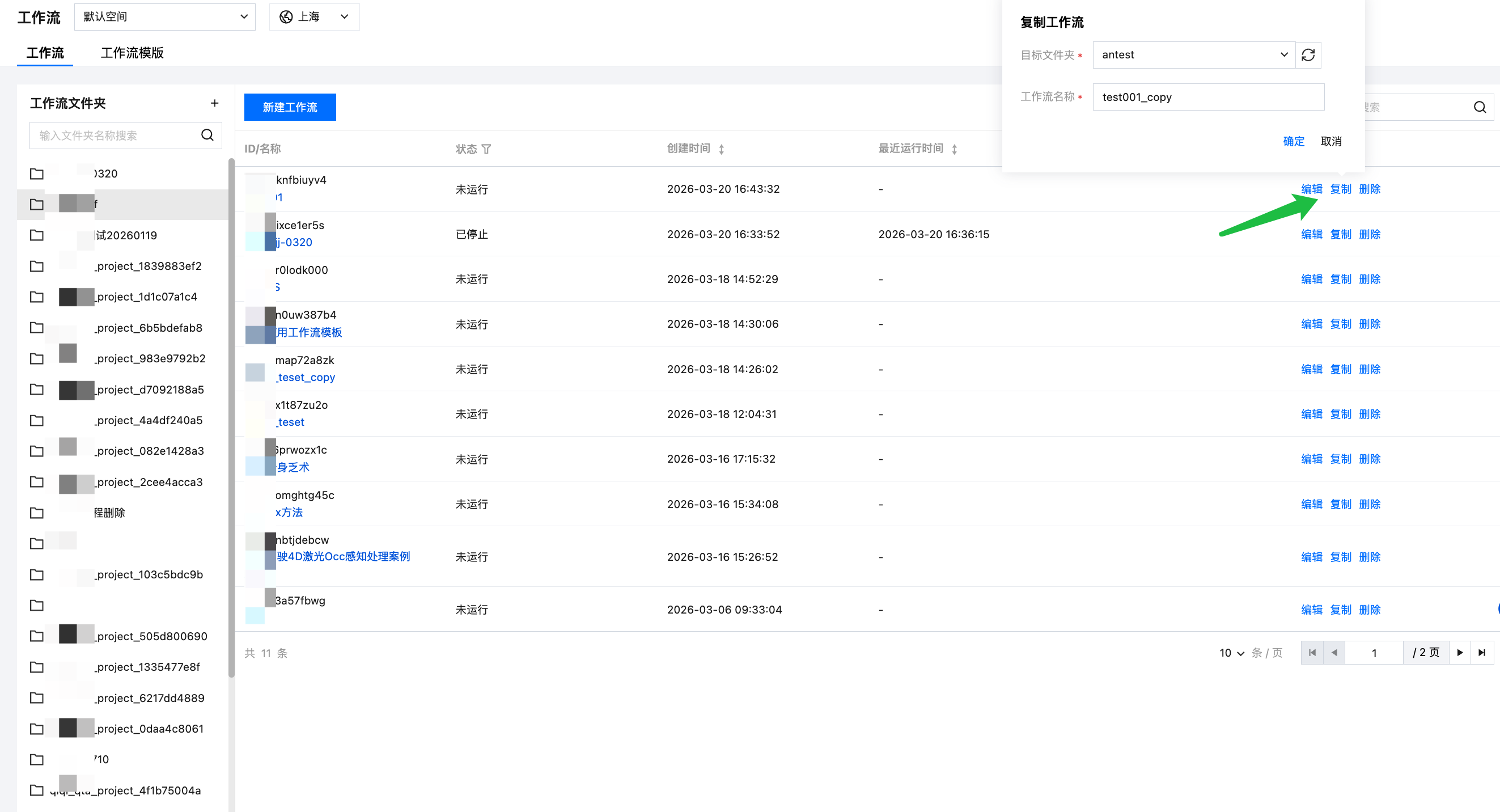 如果需要基于现有工作流创建新的变体,您可以在工作流列表中,单击目标工作流操作列的复制。在弹出的对话框中,填写工作流名称并选择目标文件夹,单击确定即可立即创建。