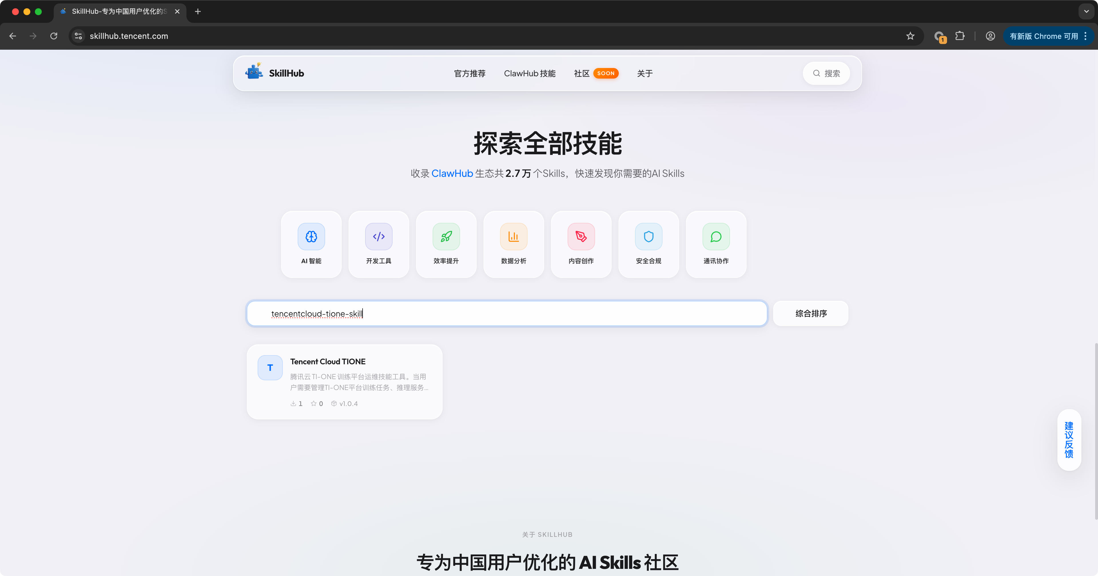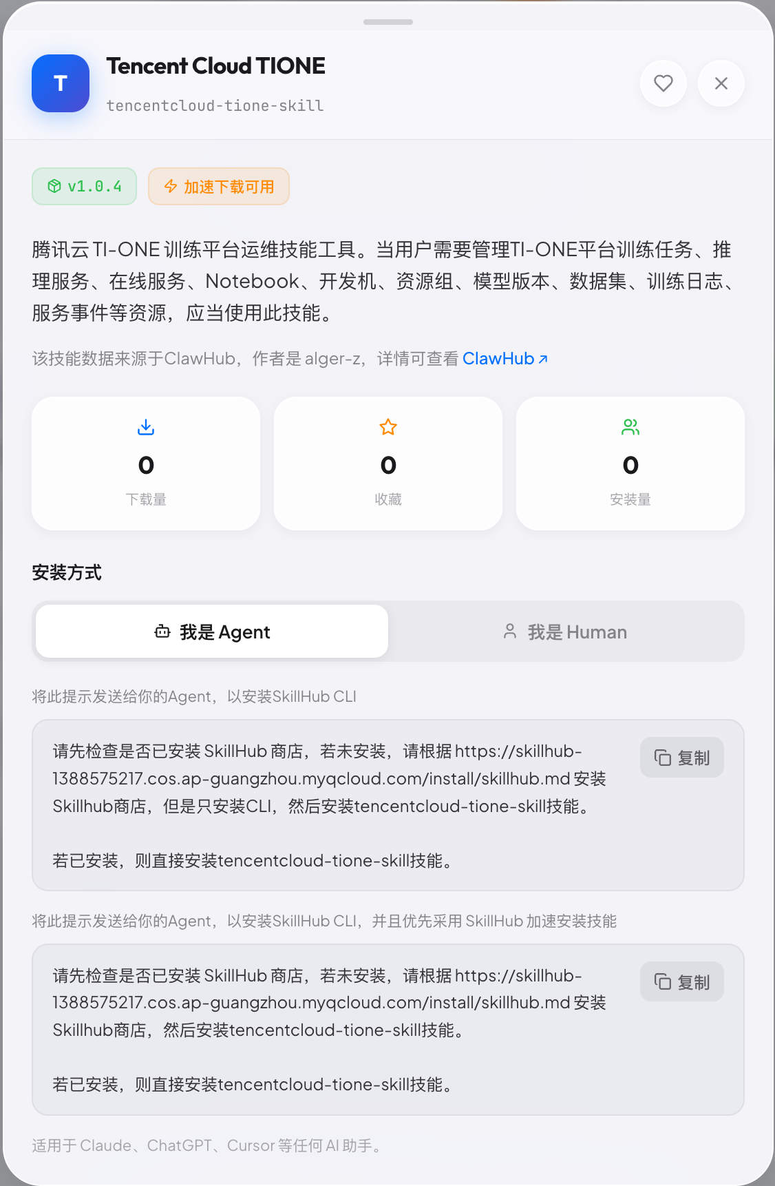 # CLI 安装curl -fsSL https://skillhub-1388575217.cos.ap-guangzhou.myqcloud.com/install/install.sh | bash -s -- --no-skillsskillhub install tencentcloud-tione-skill