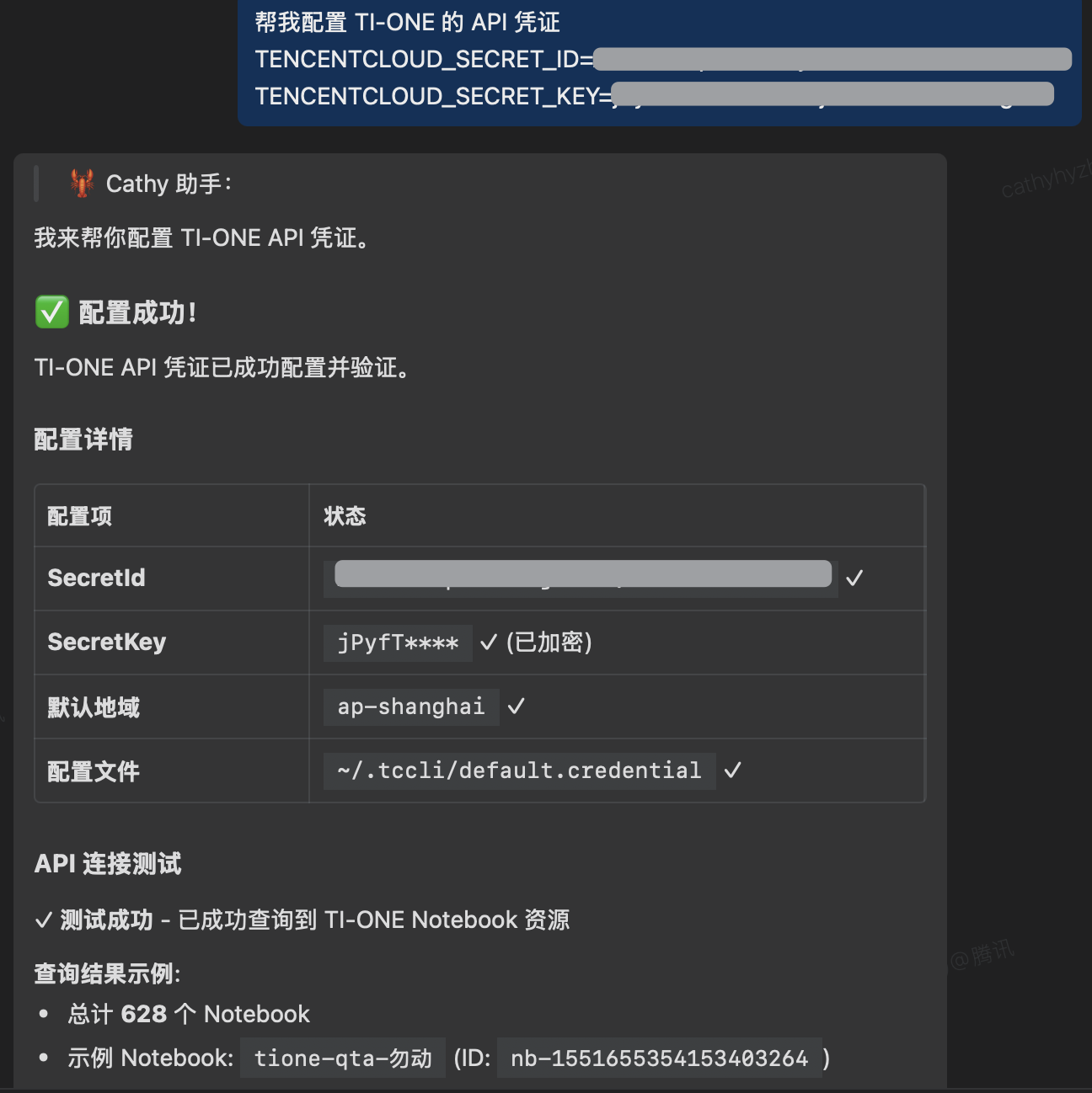 5. 如需删除凭证:@OpenClaw 助手 删除 TI-ONE API 凭证。