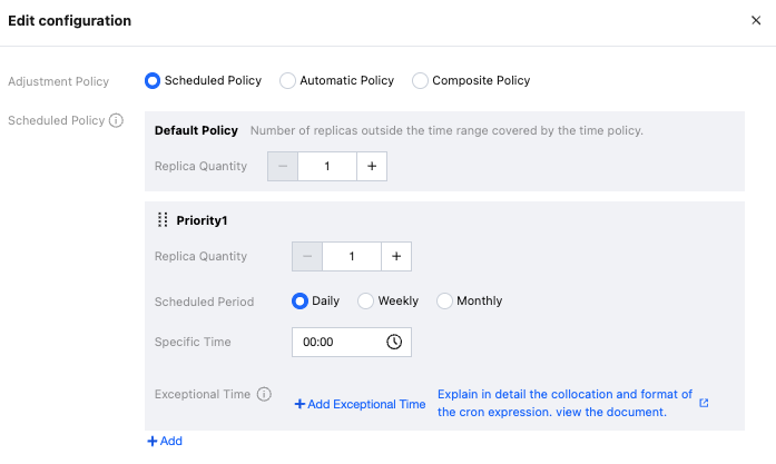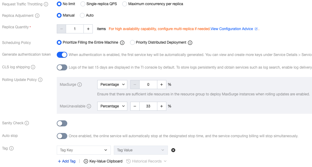 Replica Adjustment | Manual: You can customize the number of service replicas, with a minimum value of 1. Auto: You can choose a timed policy, an HPA-based automatic policy, or a combined timed+HPA policy. For details, please refer to Online Service Operation. ![]() |