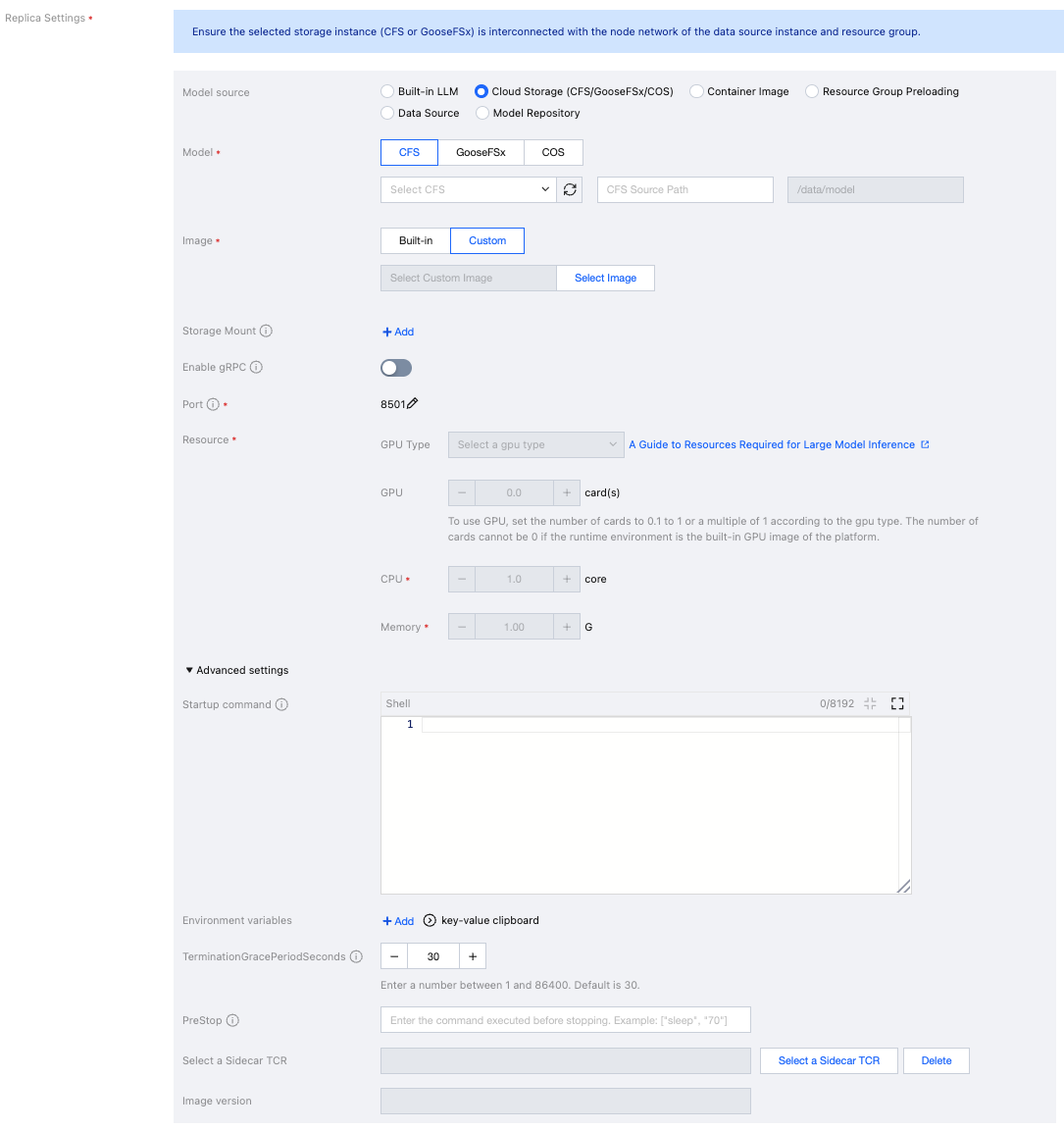 Model Source/Model | Multiple model sources are supported (the supported model sources may not be entirely consistent across different deployment modes): Built-in LLM: industry-leading open-source LLMs provided in the platform's Model Hub. Cloud Storage (CFS/GooseFSx/COS) CFS: The model files required for service deployment are stored in Cloud File Storage (CFS). Select the CFS instance where the model is located. When entering the path, specify it down to the level of the model's directory (for example, if the model is a fine-tuned checkpoint500, enter /a/b/checkpoint500 as the path). CFS Turbo is only supported when the CVM instance source is Select from CVM instances. GooseFSx: The model files required for service deployment are stored in GooseFSx. Select the GooseFSx instance where the model is located, and enter the directory of the model in the path field. GooseFSx is only supported when the CVM instance source is Select from CVM instances. COS: The model files required for service deployment are stored in Cloud Object Storage (COS). Select the bucket instance where the model is located and enter the directory. COS is only supported when the CVM instance source is Select from CVM instances. Container image: The custom image required for service deployment has encapsulated the model files, eliminating the need for model file mounting, and the custom image has been uploaded to Tencent Container Registry (TCR). Resource Group Preloading: Only applicable to the scenario of Select from CVM instances. You can preload model files/image files to the corresponding resource group in advance, improving the model loading speed during service startup. Data Source: Select the data source file that you have pre-added in the Platform Management - Data Source Management module. The Data Source Management module provides unified file permission management. Model repository: The model files required for service deployment have been imported into the Model Repository module. |