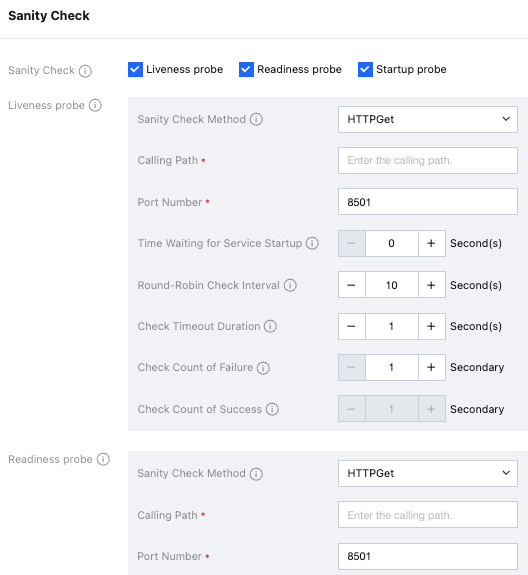 Delay for waiting service startup | After the container is started up, it indicates how long to wait before initiating the first probe. Set this value based on the application startup time to avoid false negatives due to the application not being fully started. | For example: 30-60 seconds, to give the application sufficient startup time and avoid false negatives. |