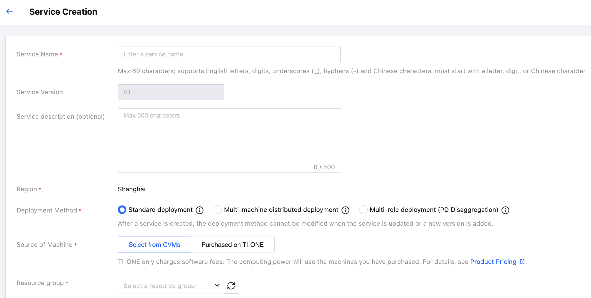 Source of Machine | You can choose Select from CVMs instances or Purchased on TI-ONE : In the Select from CVMs instances mode, you can use resource groups of CVM instances purchased in the Resource Group Management module to deploy services. The computing resource fee has been paid when the resource group is purchased, so no fees will be deducted when the service is started. In the Purchased on TI-ONE mode, you do not need to purchase a resource group in advance. Fees are charged based on the CVM instance specifications required by the service. When the service is started, fees for the first two hours are frozen. After that, fees are charged hourly based on the number of running instances. |