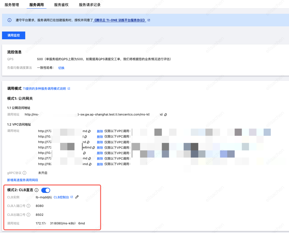 当用户在业务验证阶段使用上述的“公网访问”或“VPC访问”调用方式完成模型服务效果测试后,需要将模型服务能力正式提供给线上业务使用时,则可以进一步采取“CLB直连”的调用模式应对线上大规模、稳定的业务调用请求。