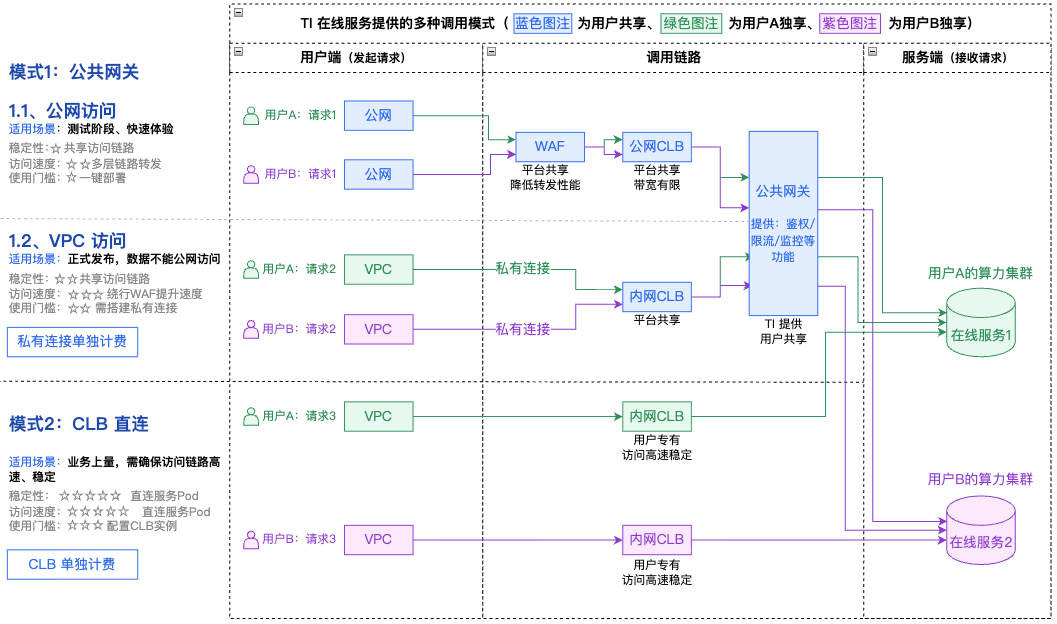 1.2 公共网关-VPC访问 | 用户在自己的腾讯云 VPC 内发起请求,通过 私有连接 建立用户 VPC 与服务的高速通道,完全绕过公网和 WAF。调用路径为:用户客户端(同地域 VPC 内)→ 内网 → TI 公共网关 → 用户服务。 注意:此模式下公共网关本身仍是多租户共享,仅网络链路变为内网。 | 对延迟敏感但对成本有要求的业务:需要比公网访问更稳定、低延迟的链路,但尚不需或不愿承担专属网关的成本。 数据安全合规要求:业务数据因合规要求不能通过公网传输。 | 低延迟:内网链路延迟低且稳定,避免了公网路由跳转和拥塞。 高带宽:内网带宽比公网带宽更高。 | 网关资源仍为共享:性能瓶颈从"网络"转移到了"公共网关实例"。在 TI 平台整体负载高峰时,用户的服务仍可能受到其他租户流量的间接影响。 配置复杂度增加:需要预先规划和配置 VPC 对等连接、路由表等网络设施,对运维人员的网络知识有要求。 |