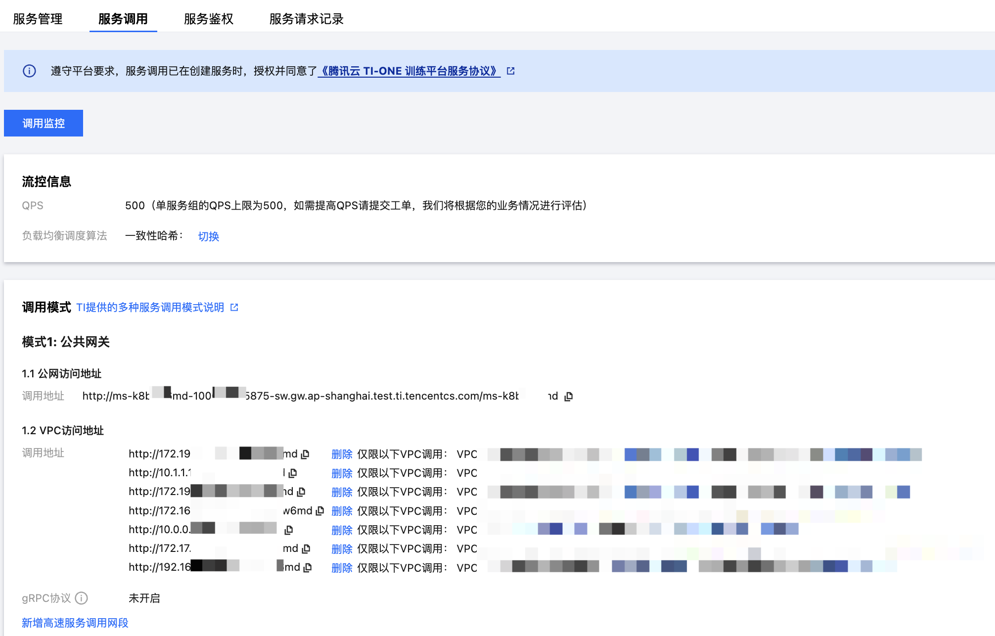 服务部署成功后,单击服务名称进入【服务调用】的详情页面,可以看到“公共网关”模式下提供的“公网访问、VPC访问”两种服务调用地址。