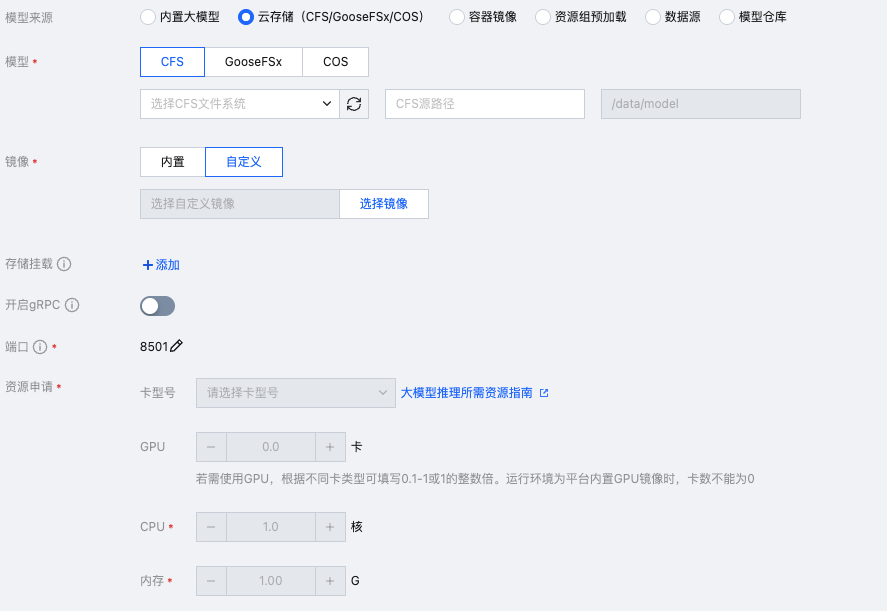 3. 使用 CFS、COS 或 GooseFS 作为模型来源时,平台默认将源路径下的模型文件(包括子目录),放在服务实例的