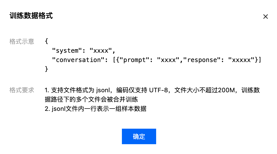 第二行 “平台 CFS”:系统默认为您配置了一份精调该大模型的示例数据;若您希望使用自定义业务数据精调该大模型,可删除此行,并在底部添加其他存储来源。