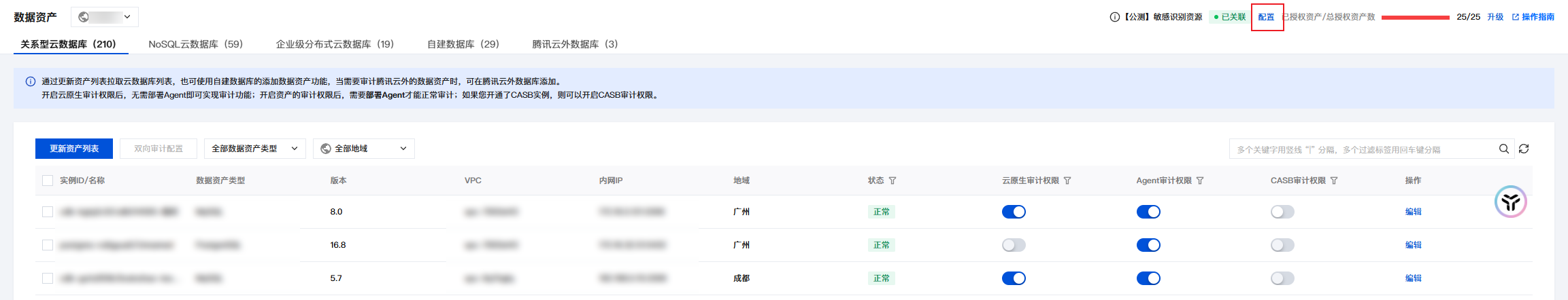 2. 在数据资产页面,单击右上角敏感识别资源-配置。