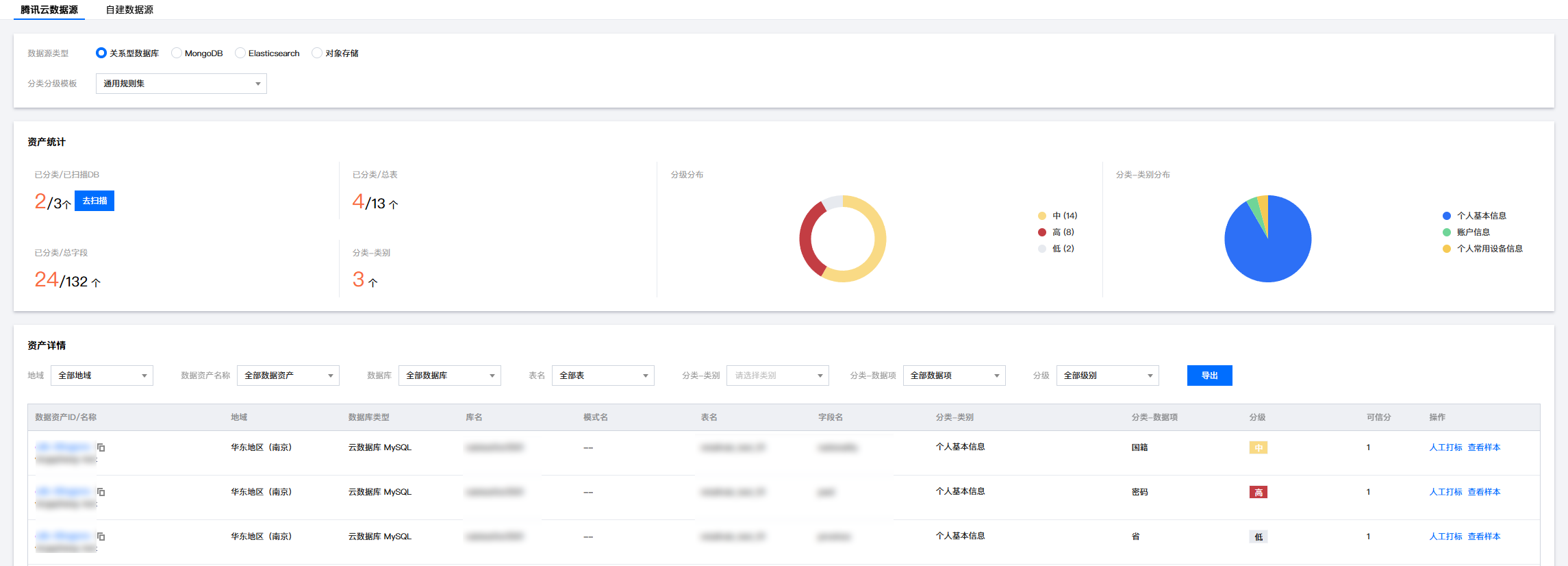 2. 在敏感数据资产页面,您可以查看指定数据库、表的敏感数据详情,同时也支持按照不同的分类、分级进行敏感数据的筛选。