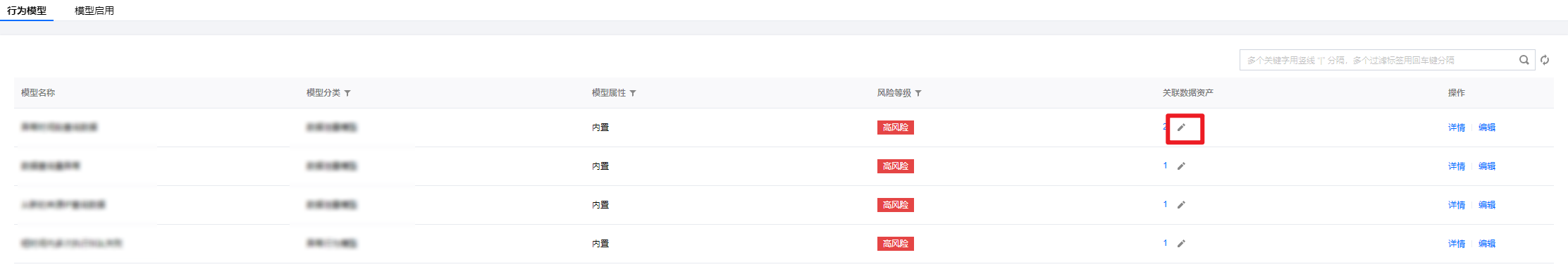 2. 在行为模型页面,选择针对敏感数据的行为模型,单击