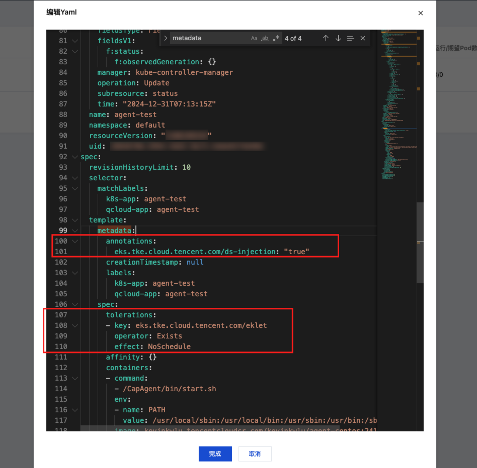 spec:template:metadata:annotations:eks.tke.cloud.tencent.com/ds-injection: "true"spec:tolerations:- key: eks.tke.cloud.tencent.com/ekletoperator: Existseffect: NoSchedule