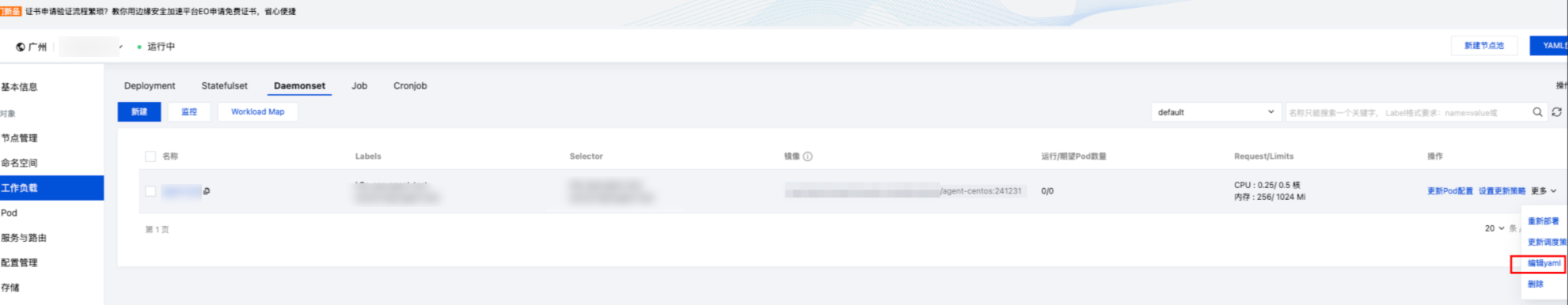 1. 在 Daemonset 页面,选择刚刚新建的 Daemonset 资源,单击操作列更多 > 编辑 yaml。